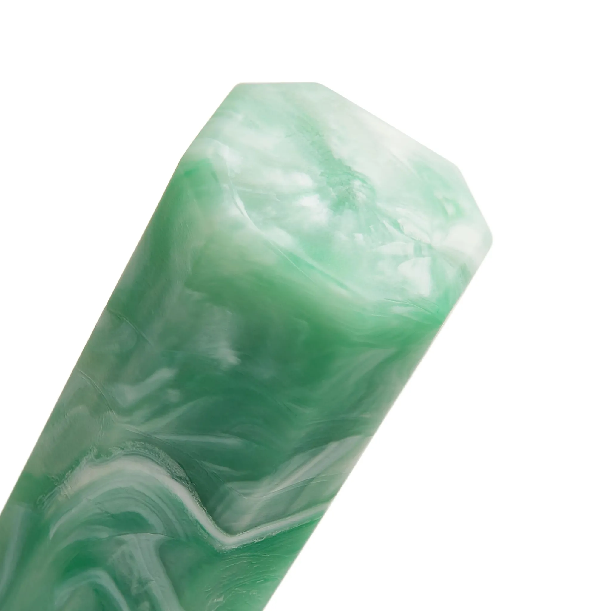 The handle is made from waste plastic from Maldon sea salt containers. The octagonal shape and mint green colour make it a beautiful addition to your table. No two handles are the same, so each knife has its own unique pattern.