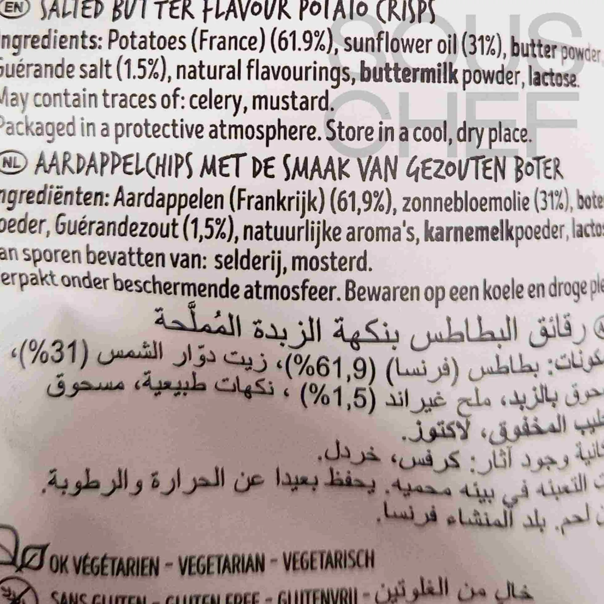 Product formulations and details may change. For the latest ingredients and allergen information always check product packaging prior to consumption. Ingredients: Potatoes (France), sunflower oil, butter powder (milk), Guerande salt (1.5%), natural flavourings, buttermilk powder (milk), lactose.