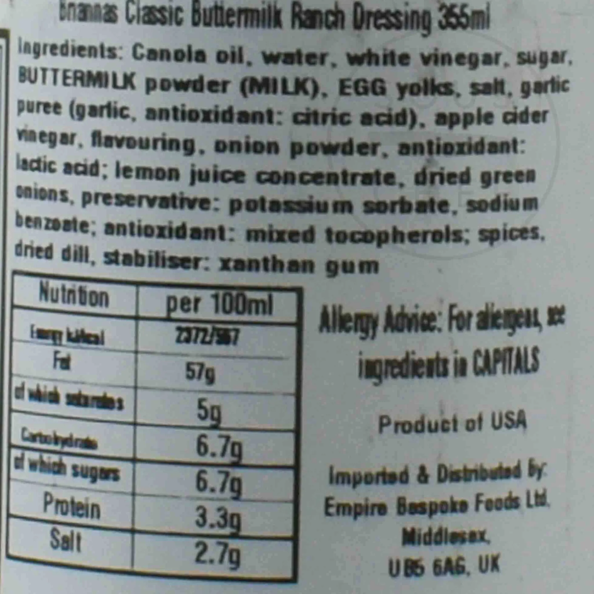 Product formulations and details may change. For the latest ingredients and allergen information always check product packaging prior to consumption. Ingredients: Canola oil, water, white vinegar, sugar, buttermilk powder (milk), egg yolks, salt, garlic puree (garlic, antioxidant: citric acid), apple cider vinegar, flavouring, onion powder, antioxidant: lactic acid; lemon juice concentrate, dried green onion, preservative: potassium sorbate, sodium benzoate; antioxidant: mixed tocopherols; spices, dried dill, stabiliser: xanthan gum