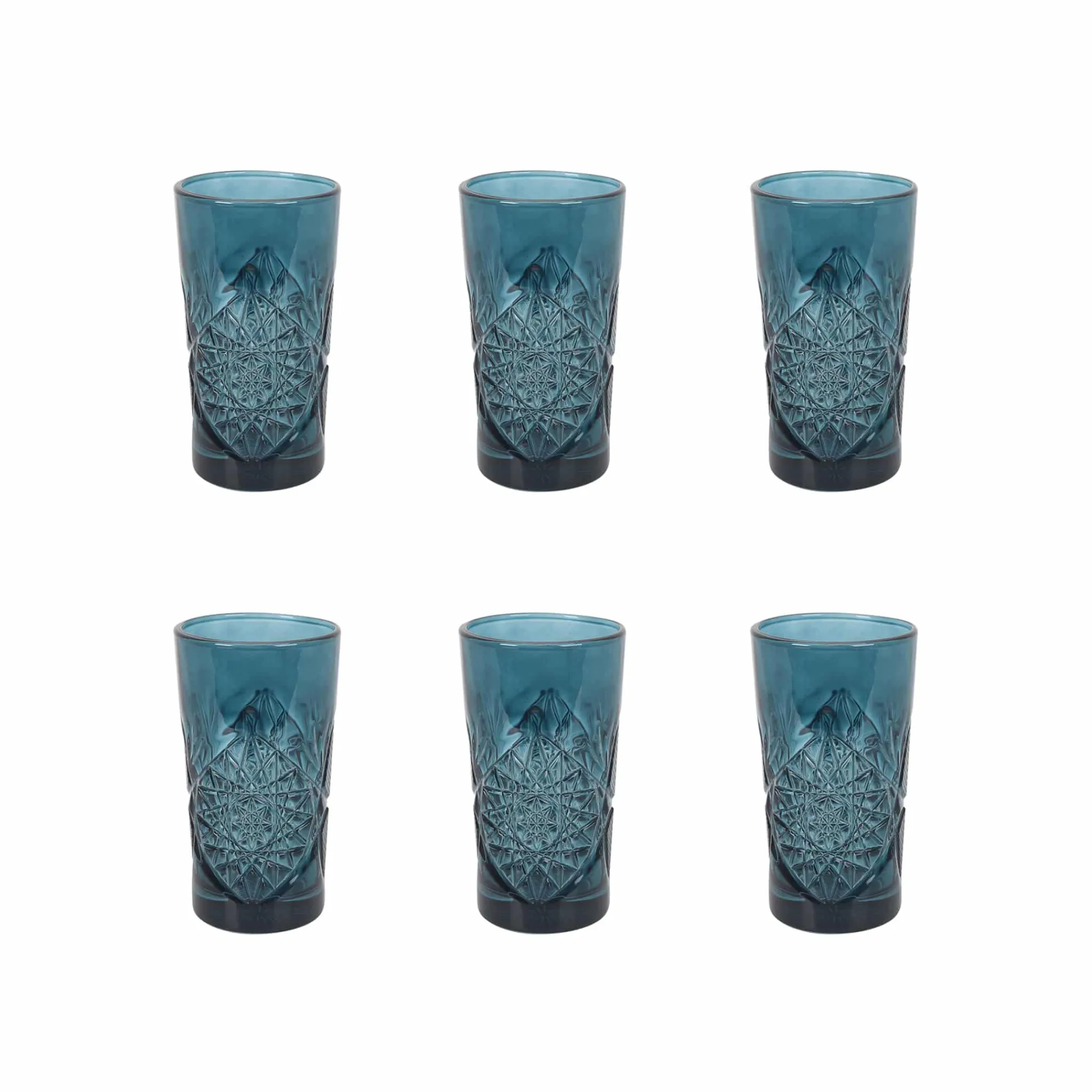 Use these blue Hobstar highball glasses to serve cocktails in vintage style. Their diamond cut design makes any occasion feel special.