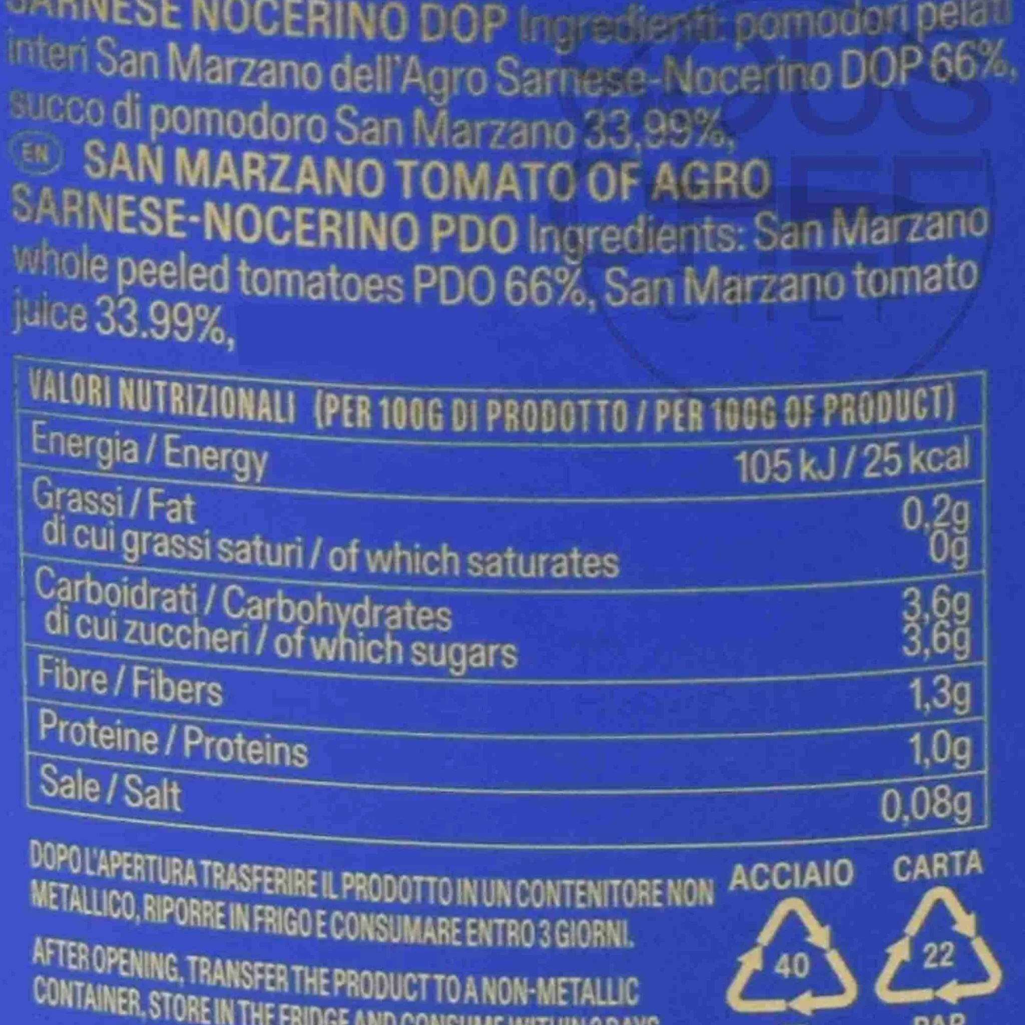 Product formulations and details may change. For the latest ingredients and allergen information always check product packaging prior to consumption. Ingredients: San Marzano whole peeled tomatoes PDO 66%, San Marzano tomato juice 33.99%