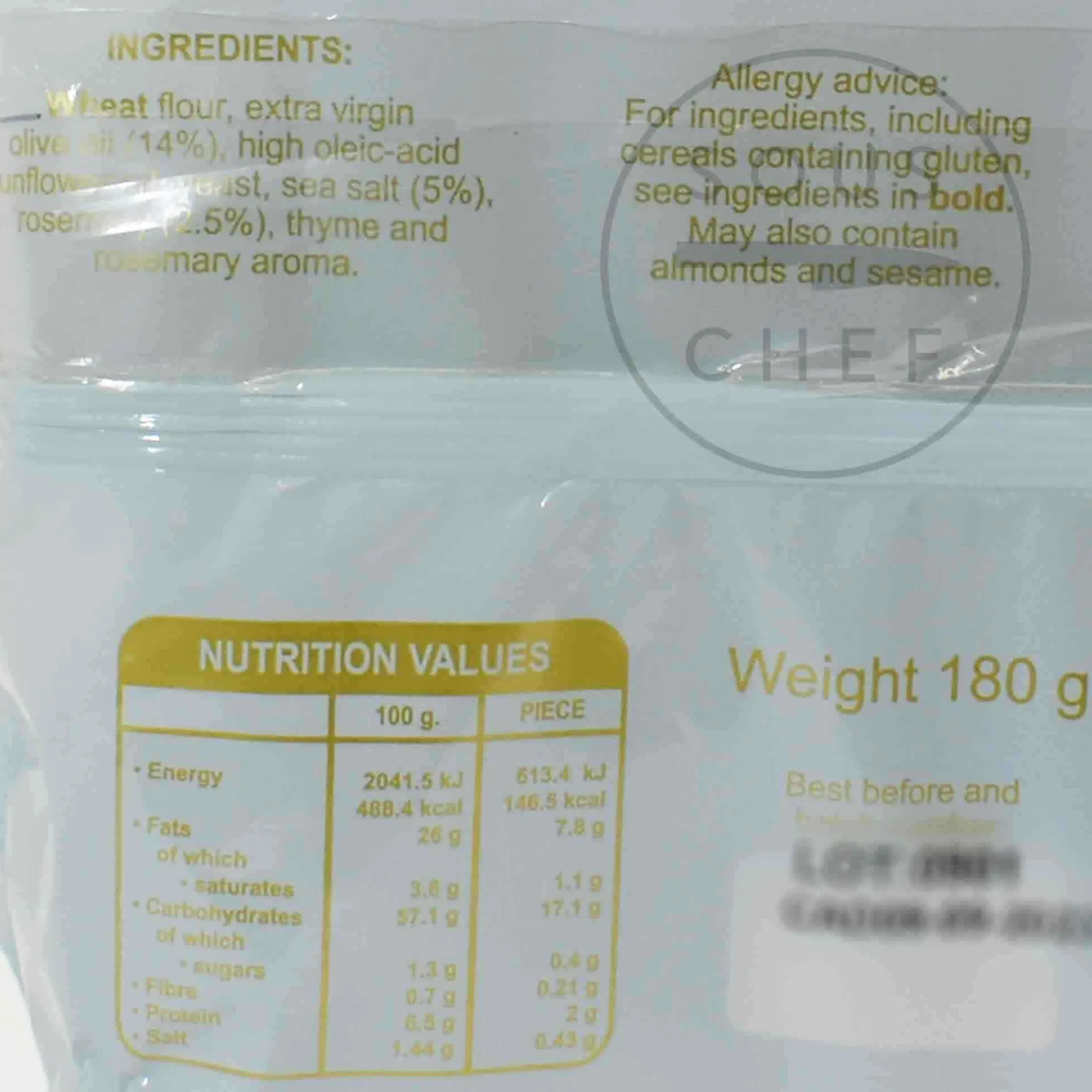 Product formulations and details may change. For the latest ingredients and allergen information always check product packaging prior to consumption. Ingredients: Wheat flour, 14% extra virgin olive oil, 10% sunflower oil, yeast, salt, rosemary, thyme and rosemary aroma.