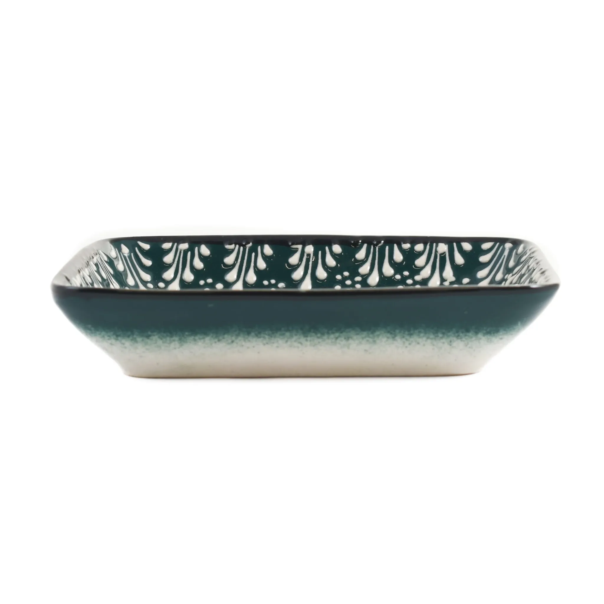 Use this rectangular dish to serve meze dishes in Turkish style. It features a beautiful hand-painted design on a dark green background.