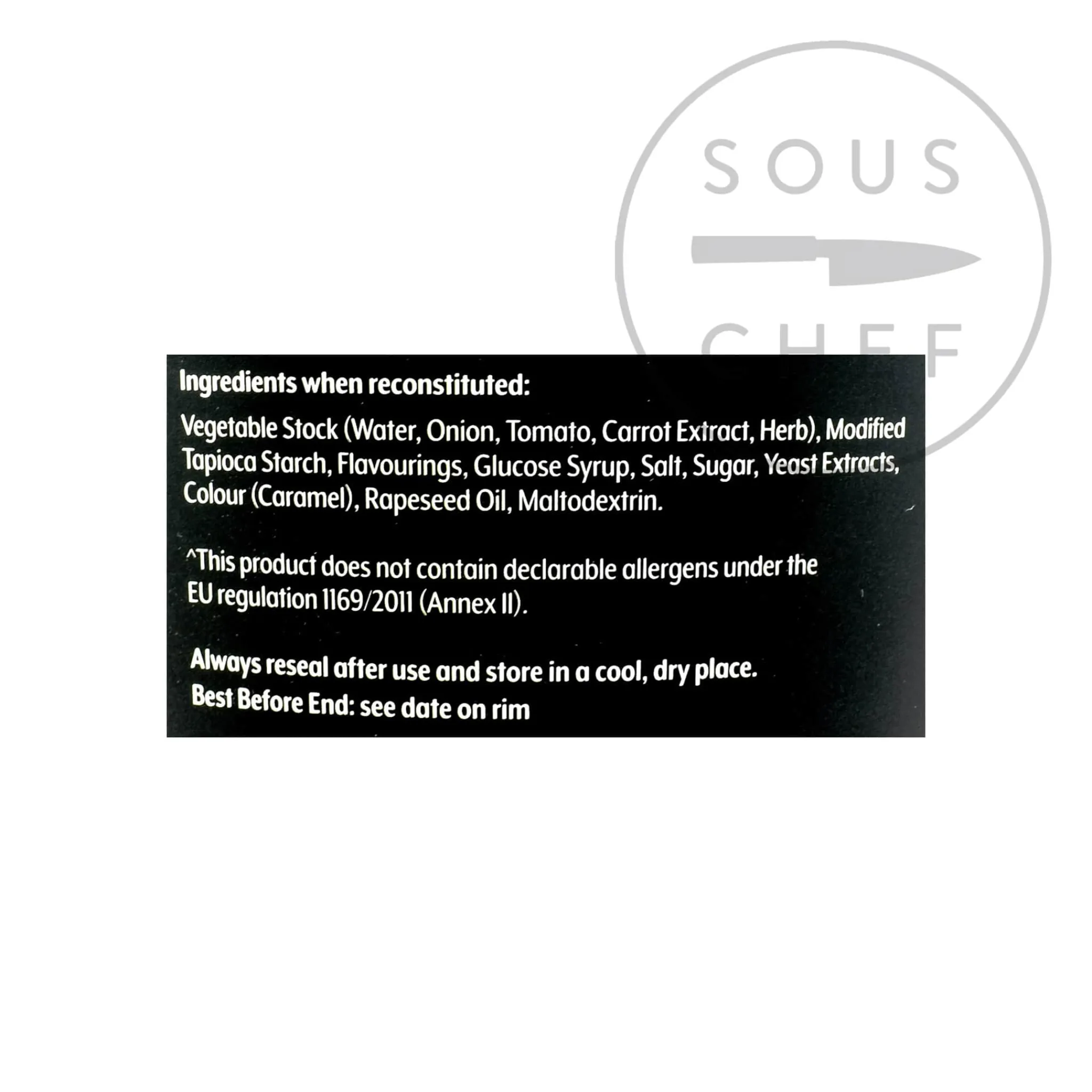 Product formulations and details may change. For the latest ingredients and allergen information always check product packaging prior to consumption. Ingredients: Vegetable stock (water, onion, tomato, carrot extract, herb), modified tapioca starch, flavourings, glucose syrup, yeast extracts, colour (caramel) rapeseed oil, maltodextrin.