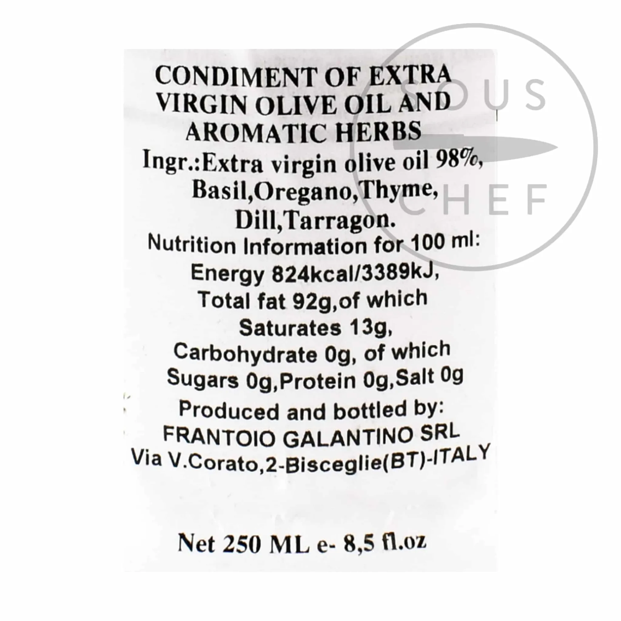 Product formulations and details may change. For the latest ingredients and allergen information always check product packaging prior to consumption. Ingredients: extra virgin olive oil 98%, basil, oregano, thyme, dill, tarragon.
