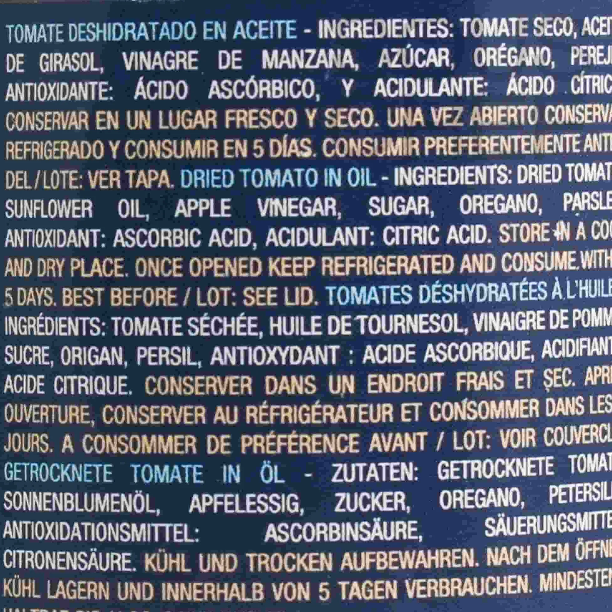 Product formulations and details may change. For the latest ingredients and allergen information always check product packaging prior to consumption. Ingredients: Dried tomato, sunflower oil, apple vinegar, sugar, oregano, parsley, antioxidant: ascorbic acid, acidulant: citric acid.