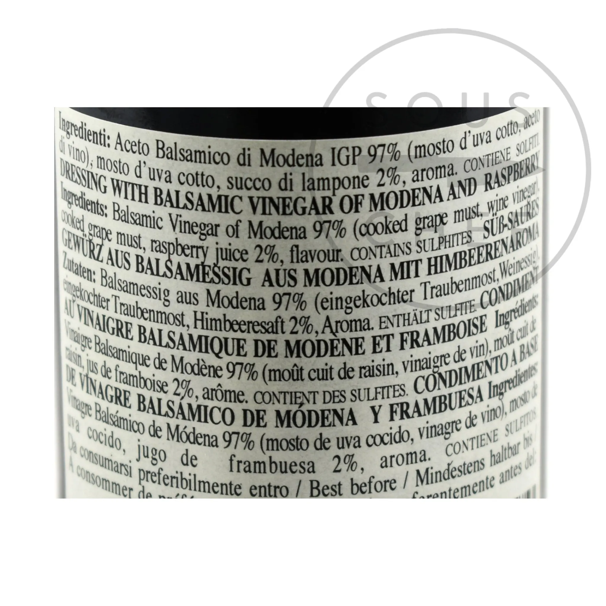 Product formulations and details may change. For the latest ingredients and allergen information always check product packaging prior to consumption. Ingredients: Raspberry vinegar: Balsamic vinegar of Modena 97% (cooked grape must, wine vinegar), cooked grape must, raspberry juice 2%, flavour. Fig vinegar: Balsamic vinegar of Modena 97% (cooked grape must, wine vinegar), cooked grape must, fig puree 2%, flavour. Black truffle vinegar: Balsamic vinegar of Modena 97% (cooked grape must, wine vinegar), cooked grape must, black dehydrated truffle (Tuber Melanosporum) 0.30% (equal to 1.2% of fresh truffle), truffle flavour 0.1%. Contains sulphites.