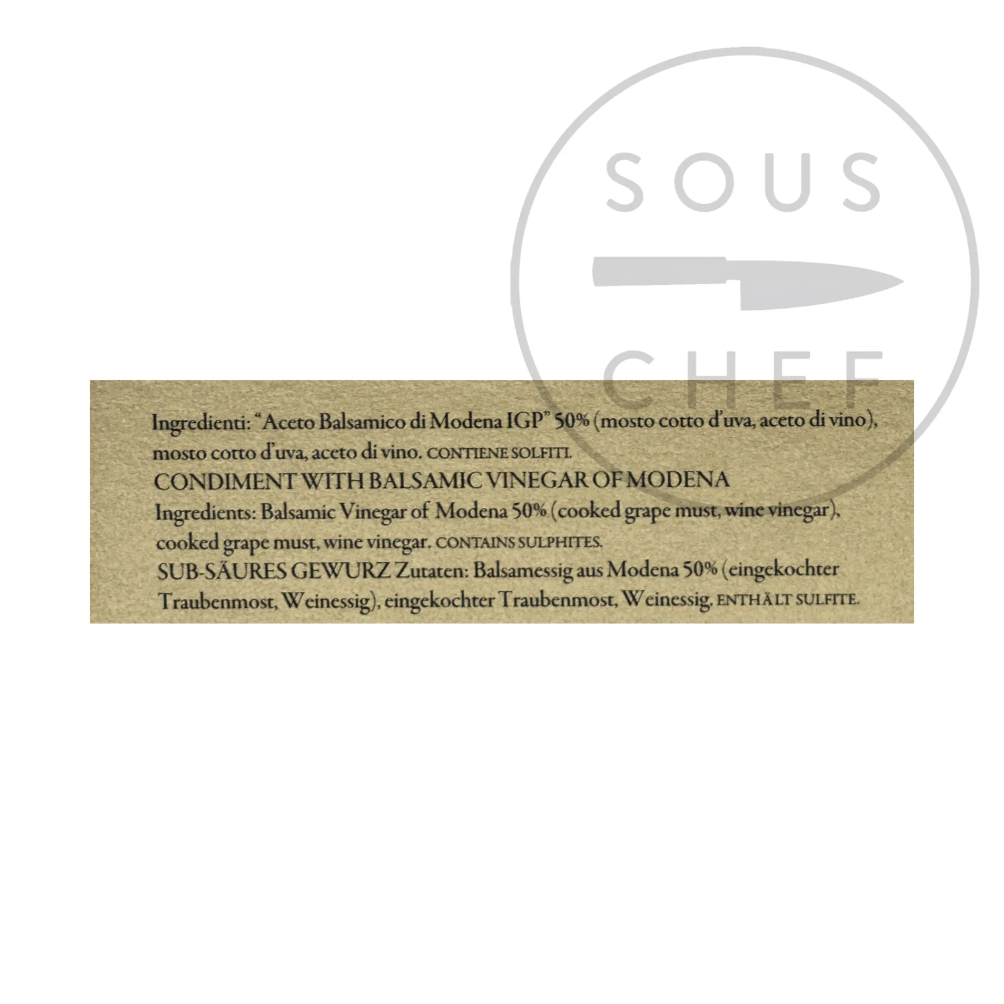 Product formulations and details may change. For the latest ingredients and allergen information always check product packaging prior to consumption. Ingredients: Balsamic vinegar of Modena 50% (cooked grape must, wine vinegar), cooked grape must, wine vinegar. Contains sulphites.