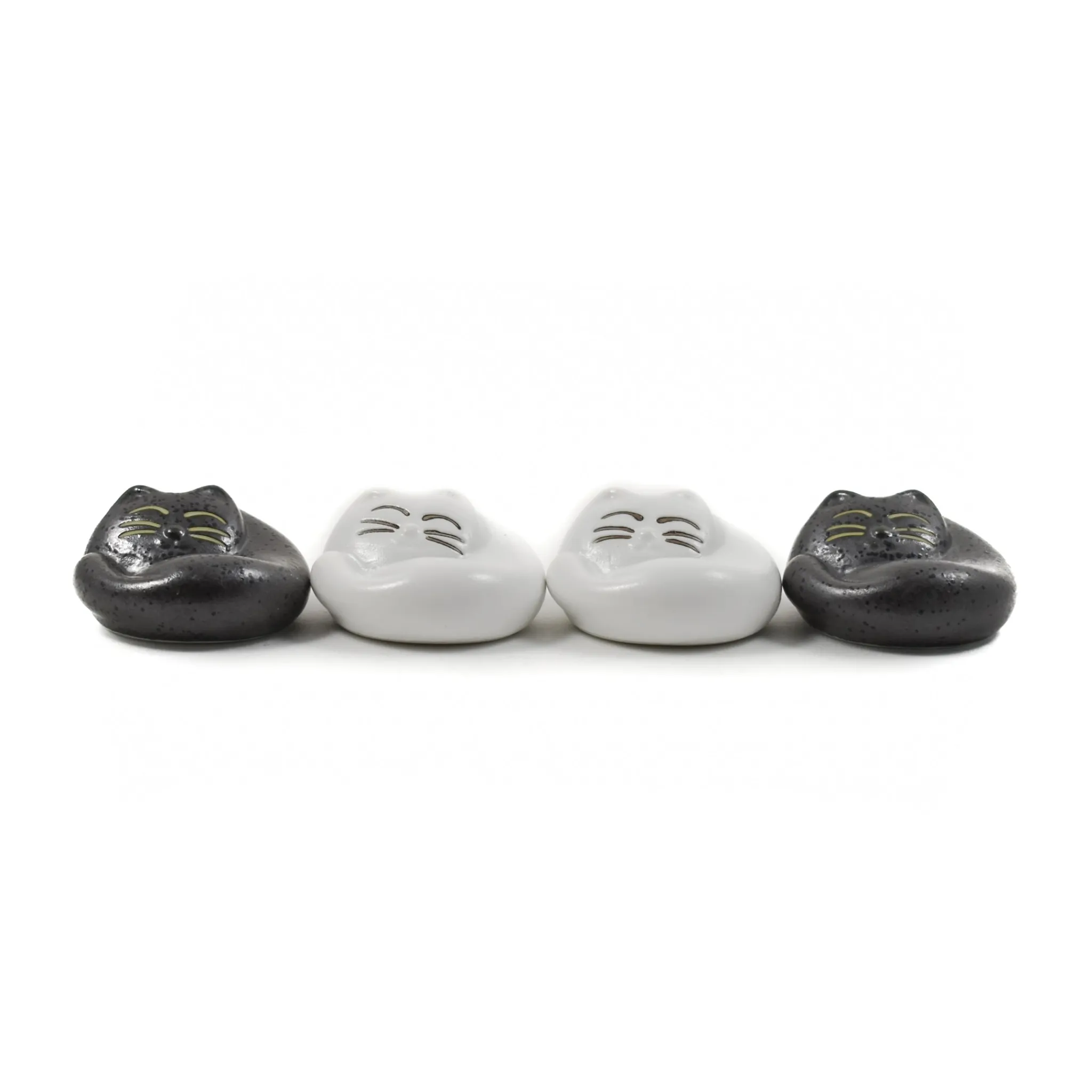 The set comes with 2 black and 2 white cat chopstick rests, and is presented in a black gift box.