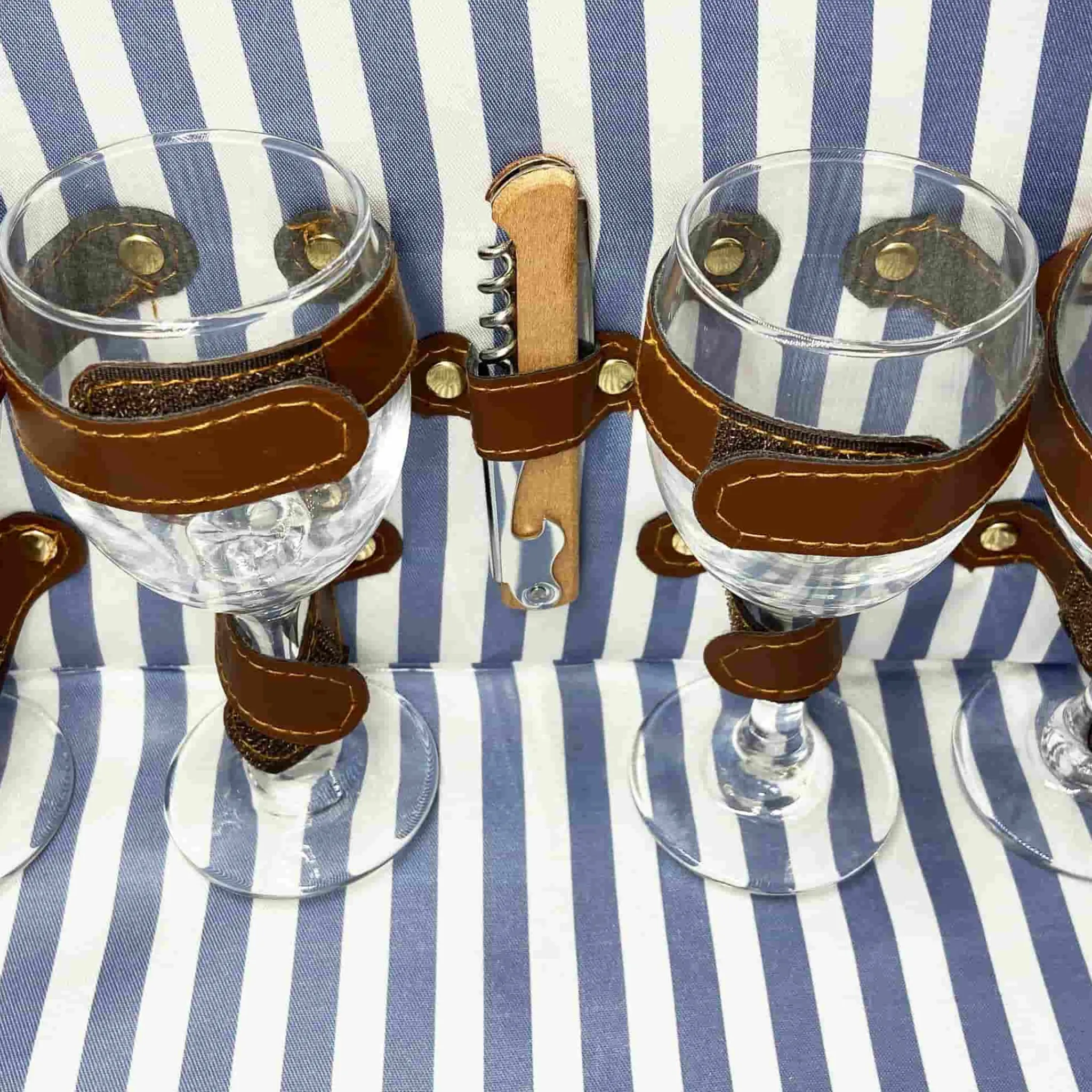 The Saint-Malo blue striped picnic basket is one of the most innovative hampers designed by Les Jardins de la Comtesse. Once you’ve found the perfect picnic spot, you can unfold the metal legs beneath the wooden lids to use as a small table. There are four notches on the sides of the table to hold your wine glasses while you relax in the sunshine.