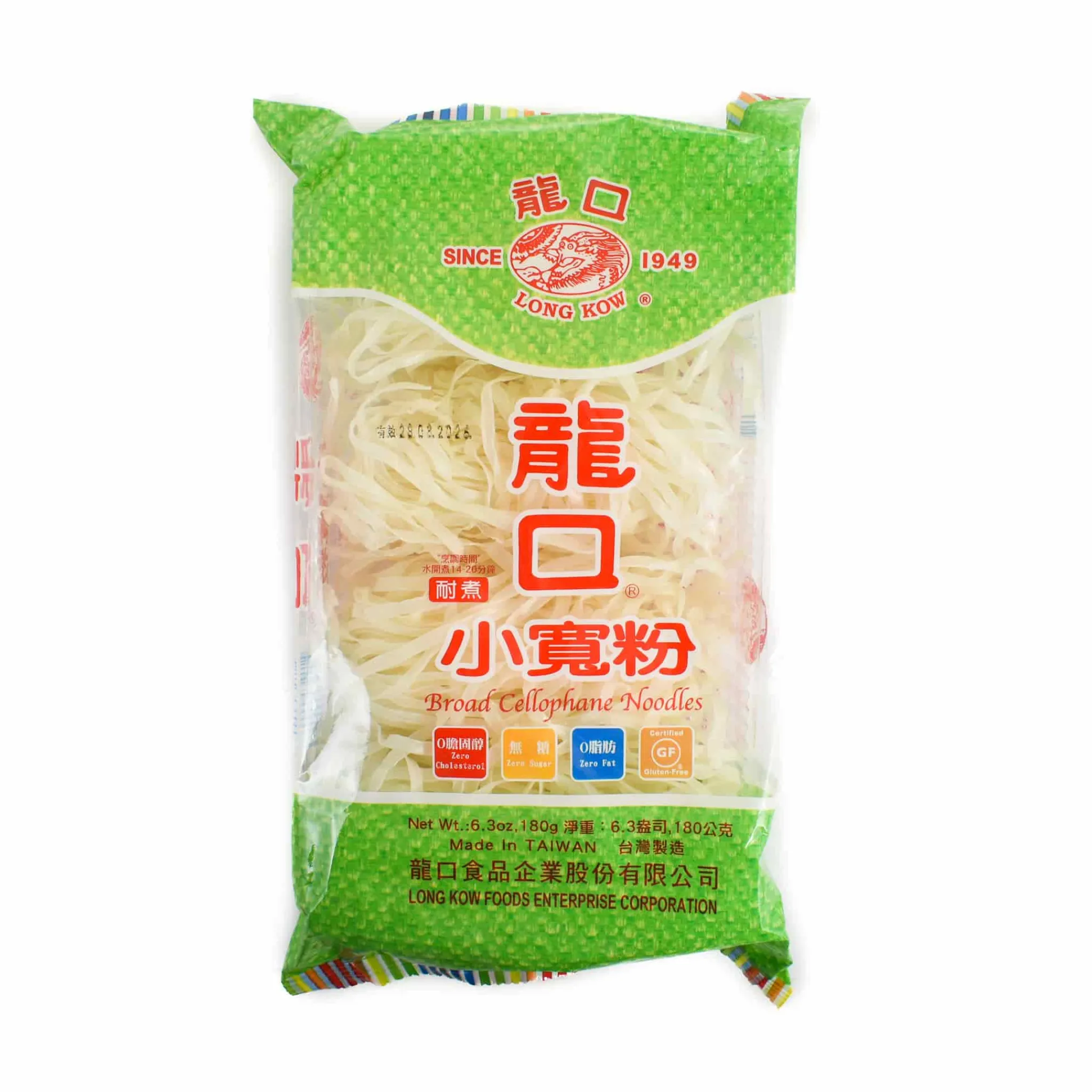 Broad bean threads are transparent noodles made from mung bean starch. They are also known as glass or cellophane noodles. These bean threads have a flat, wide shape similar to pad Thai noodles.