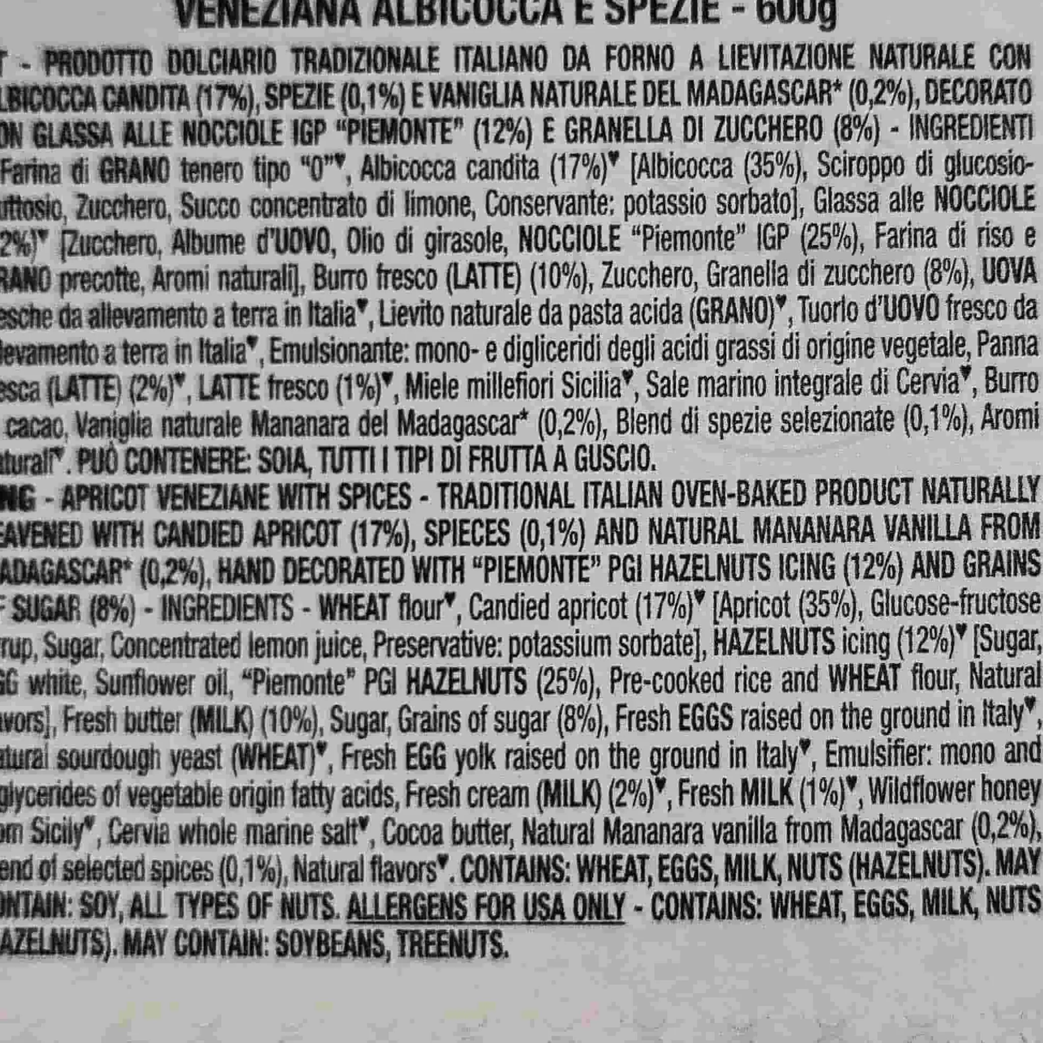 Product formulations and details may change. For the latest ingredients and allergen information always check product packaging prior to consumption. Ingredients: Wheat flour, candied apricot (17%) [apricot (35%), glucose-fructose syrup, sugar, concentrated lemon juice, preservative: potassium sorbate], hazelnuts icing (12%) [sugar, egg white, sunflower oil, “piemonte” pgi hazelnuts(25%), pre-cooked rice and wheat flour, natural flavours], fresh butter (milk) (10%), sugar, grains of sugar (8%), fresh eggs raised on the ground in italy, natural sourdough yeast (wheat), fresh egg yolk raised on the ground in italy, emulsifier: mono and diglycerides of vegetable origin fatty acids, fresh cream (milk) (2%), fresh milk (1%), wildflower honey from sicily, cervia whole marine salt, cocoa butter, natural mananara vanilla from madagascar* (0,2%), blend of selected spices (0,1%), natural flavours