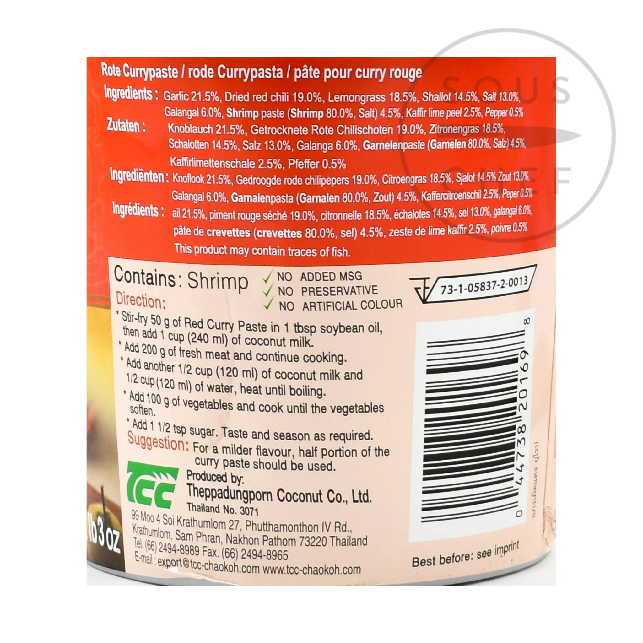 Product formulations and details may change. For the latest ingredients and allergen information always check product packaging prior to consumption. Ingredients: Garlic 21.5%, Dried red chilli 19%, Lemongrass 18.5%, Shallot 14.5%, Salt 13%, Galangal 6%, Shrimp paste (Shrimp 80%, Salt)4.5%, Kaffir lime peel 2.5%, Pepper 0.5%