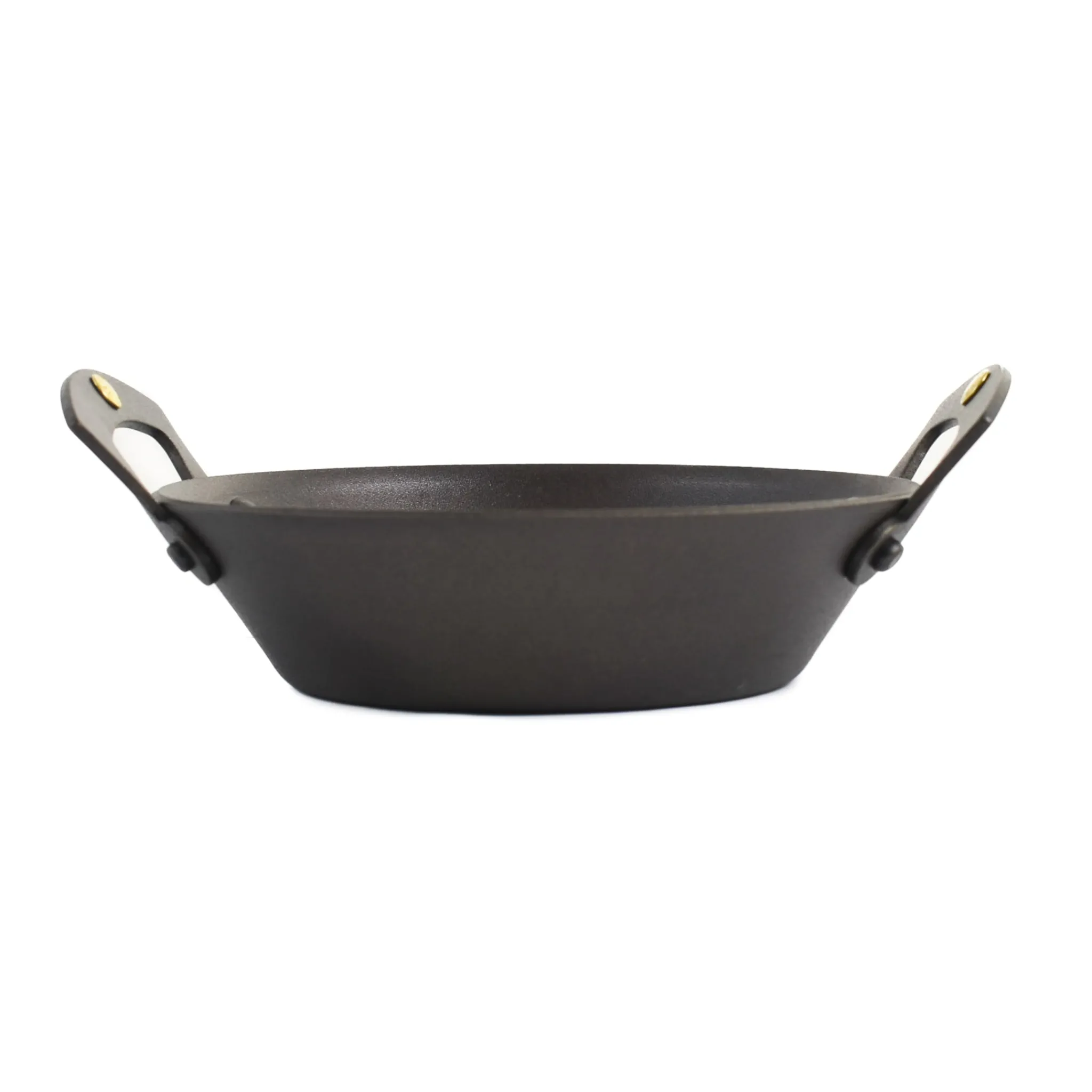 The double-handled pan is made from 99.1% pure spun iron. It can withstand very high temperatures so it’s great for frying and browning. You can use it on open fires and all kinds of hobs, including induction.