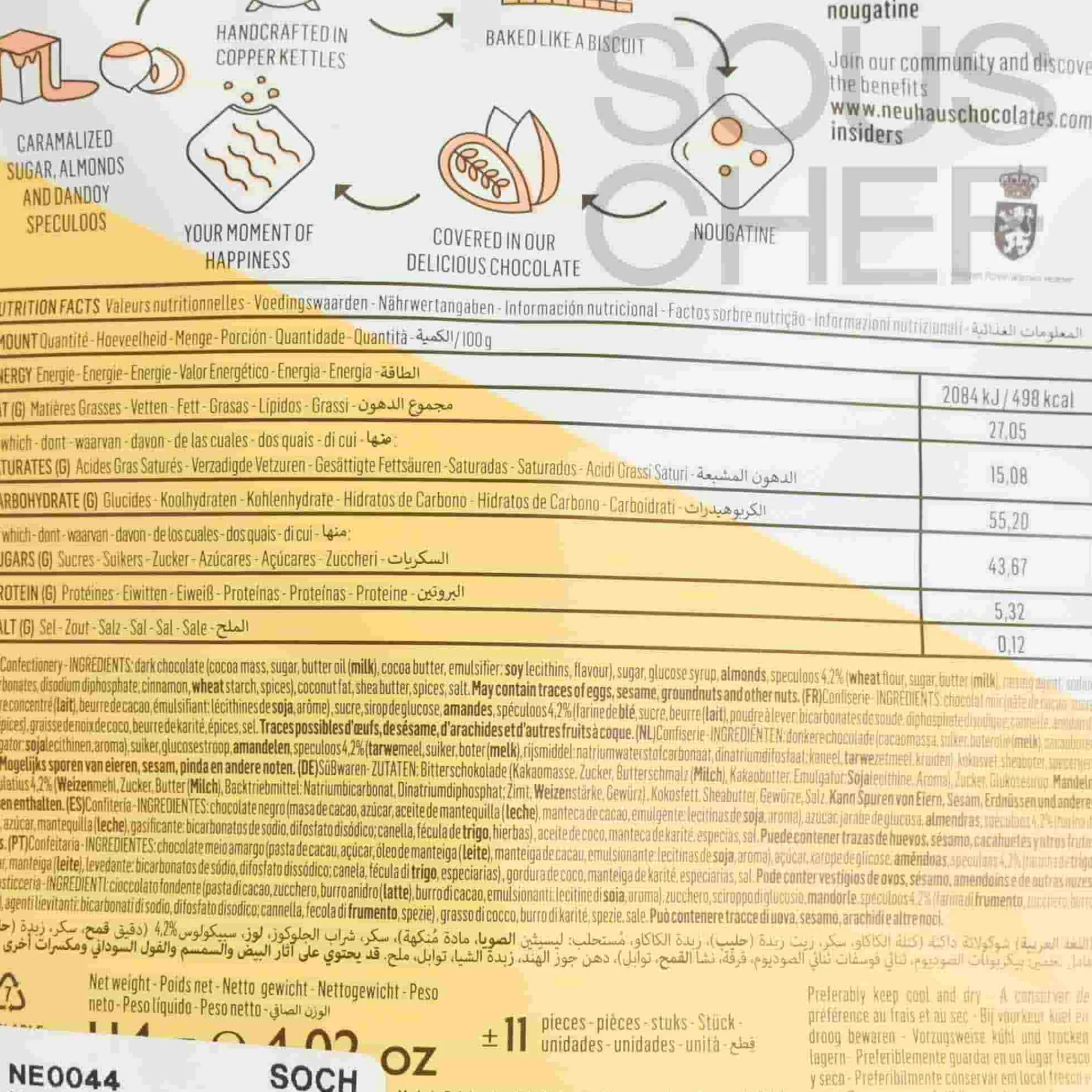 Neuhaus chocolate speculoos thins are nougatine biscuits covered in dark chocolate. The nougatine is enriched with speculoos, a traditional Belgian biscuit.