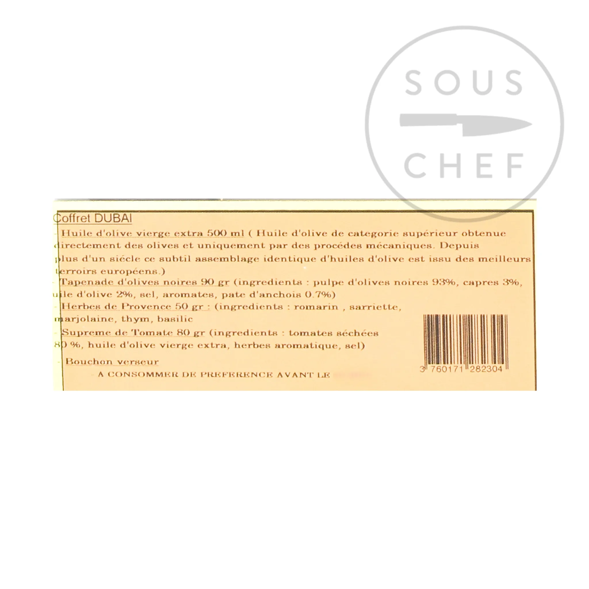 Product formulations and details may change. For the latest ingredients and allergen information always check product packaging prior to consumption. Ingredients: Extra virgin olive oil: extra virgin olive oil obtained by cold extraction. Black olive tapenade: black olive pulp (93%), capers (3%), olive oil (2%), salt, herbs & spices, anchovy (fish) paste (0.7%). Herbes de Provence: rosemary, savory, marjoram, thyme, basil. Dried tomato paste: dried tomatoes 80%, extra virgin olive oil, herbs, salt.