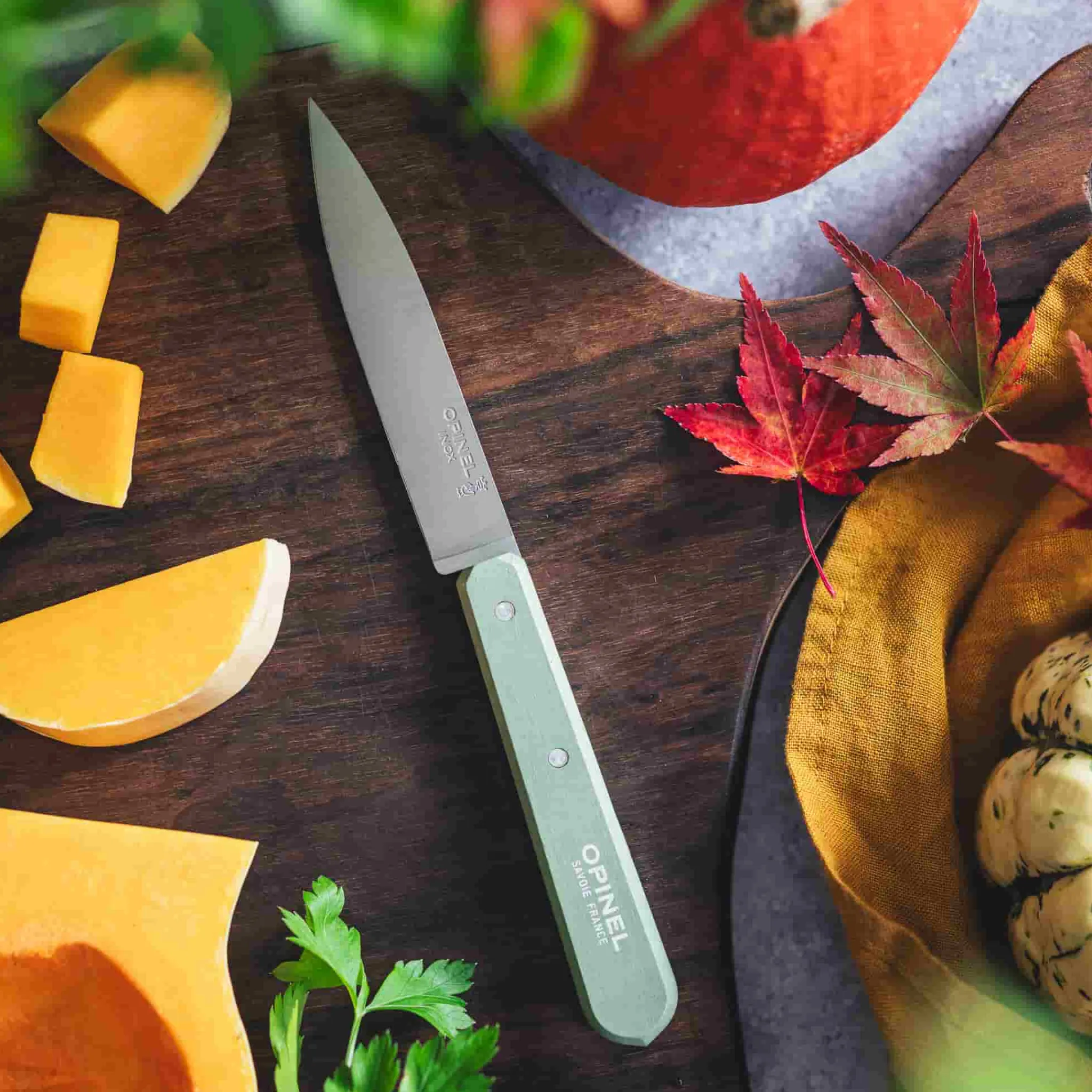 The Opinel No. 112 paring knife is a versatile kitchen tool. It has a sage handle and stainless steel blade. It’s light and compact – ideal for everyday use.