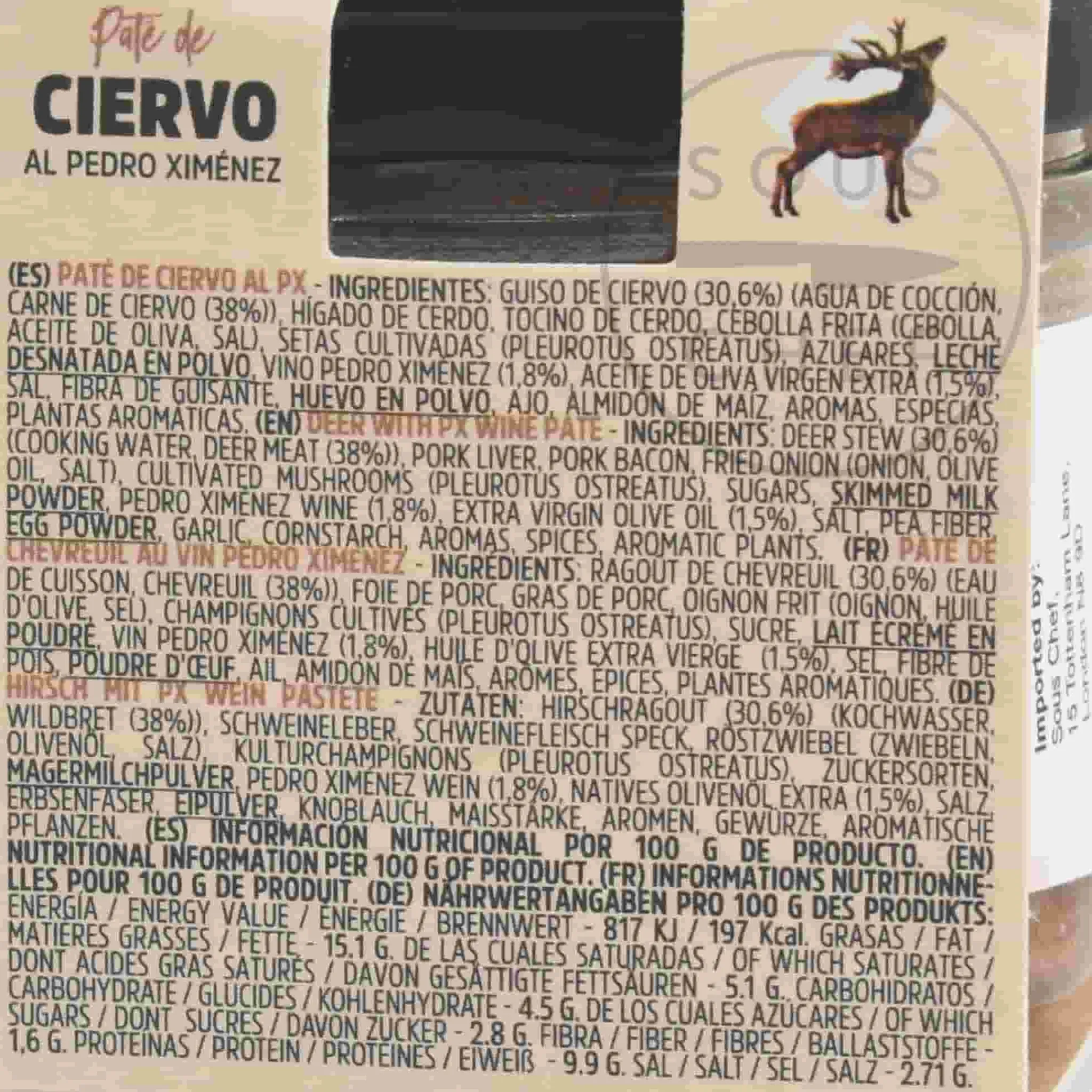 Product formulations and details may change. For the latest ingredients and allergen information always check product packaging prior to consumption. Ingredients: Deer stew (30,6%) (cooking water, deer meat (38%)), pork liver, pork bacon, fried onion (onion, olive oil, salt), cultivated mushrooms (pleurotus ostreatus), sugars, skimmed milk powder, pedro ximénez wine (1,8%), extra virgin olive oil (1,5%), salt, pea fiber, egg powder, garlic, cornstarch, aromas, spices, aromatic plants.