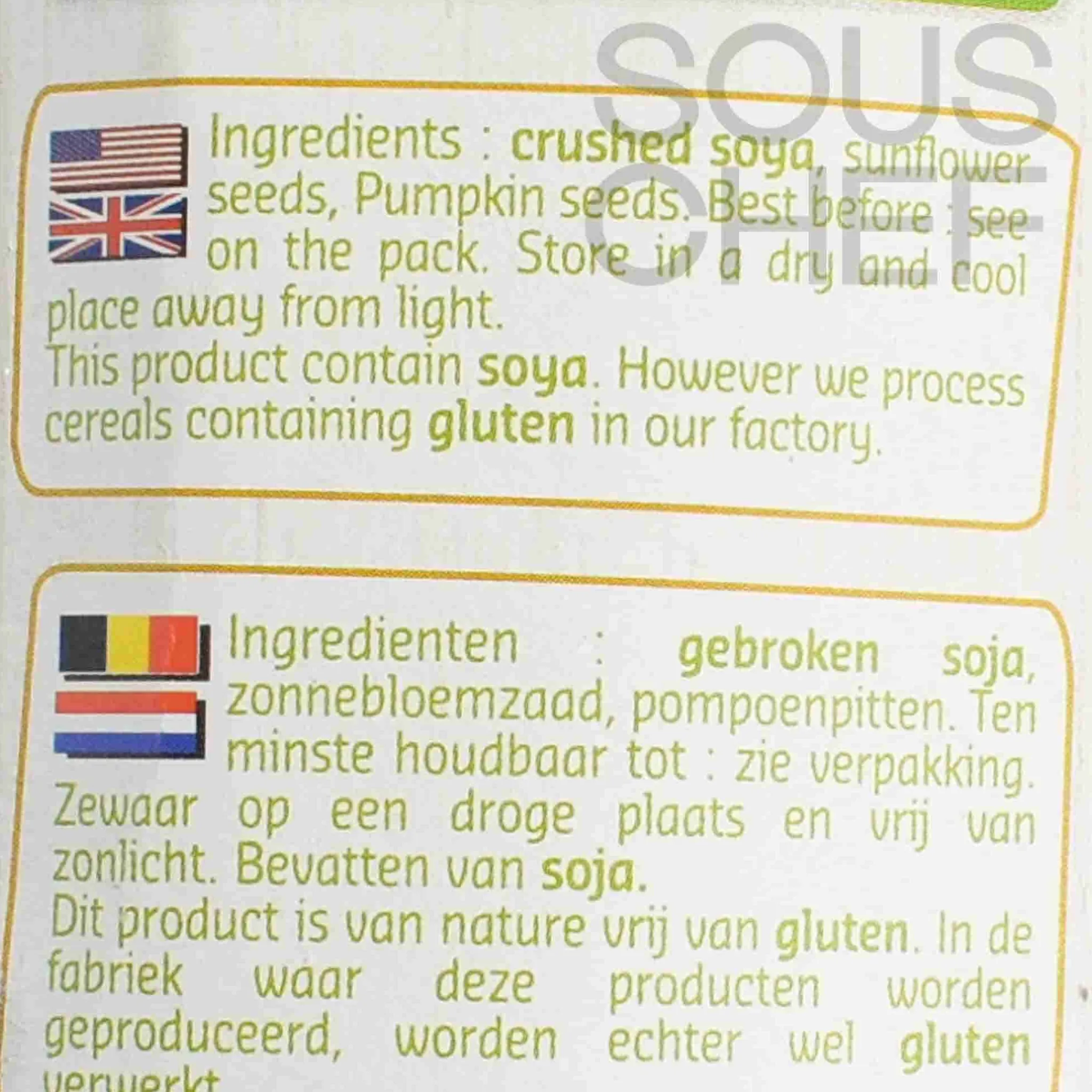 Product formulations and details may change. For the latest ingredients and allergen information always check product packaging prior to consumption. Ingredients: 40% organic crushed soybeans, 40% organic sunflower seeds, 20% organic pumpkin seeds