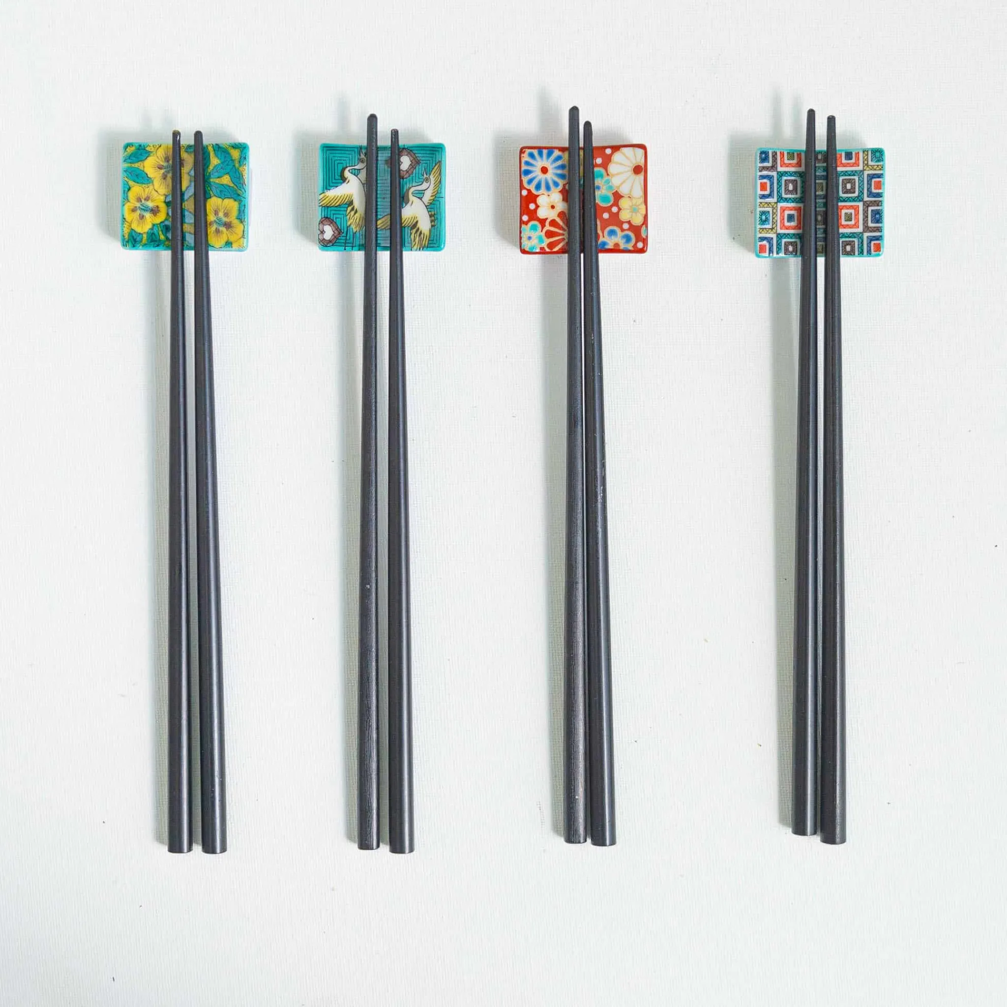 The Aoi porcelain chopsticks rest is decorated with a delicate floral design in shades of blue and yellow. Made in Japan, the small square rest is a stylish and practical way to keep your table clean while you’re enjoying your meal. Simply place your chopsticks on the rest while you’re sipping sake or reaching for the last dumpling. Matching chopsticks are available to create an eye-catching dining set.