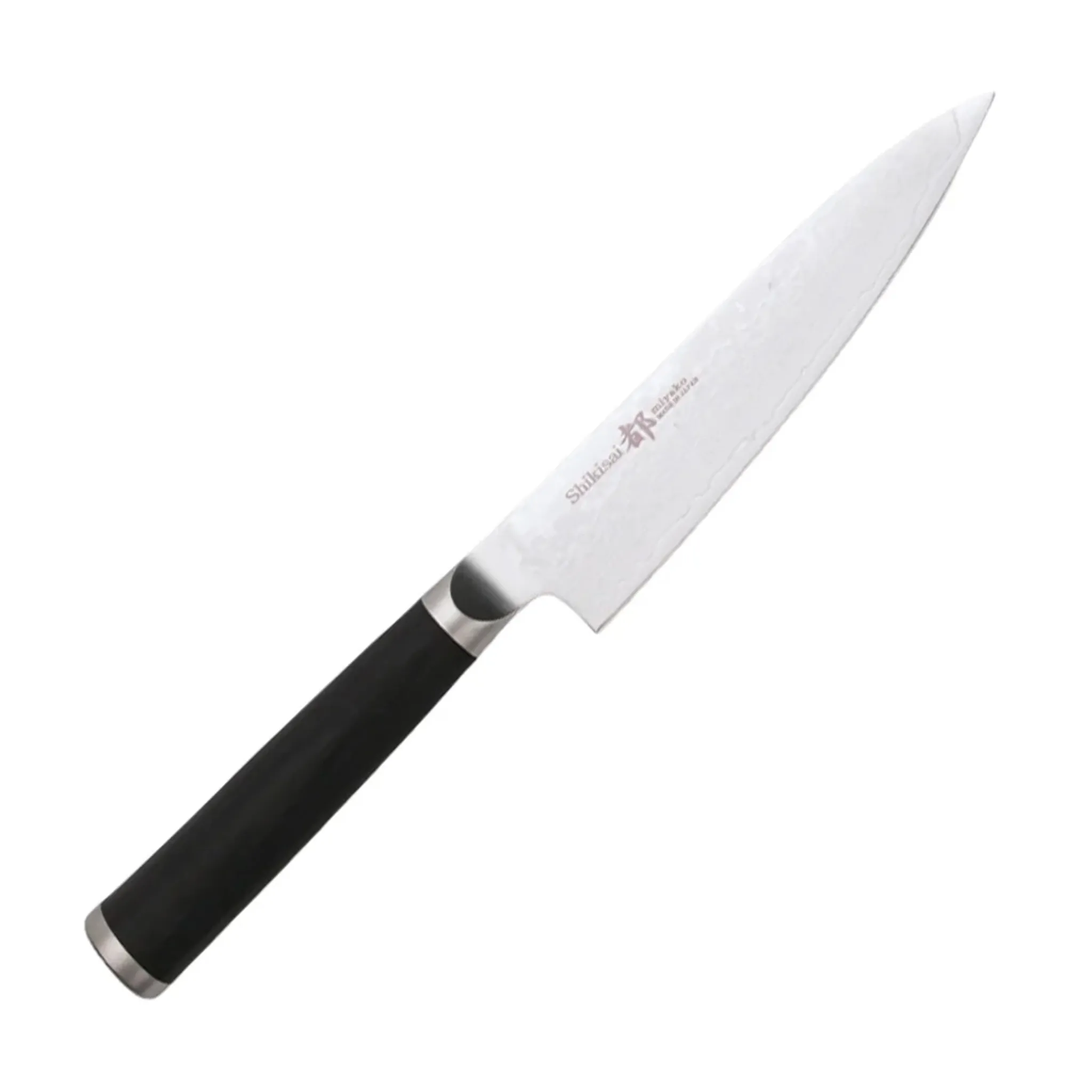 The Shikisai Miyako utility knife is ideal for precise cutting tasks. Made from ultra-sharp Damascus steel, it has a slim profile and pointed tip. It’s typically used for slicing vegetables and preparing meat and fish.