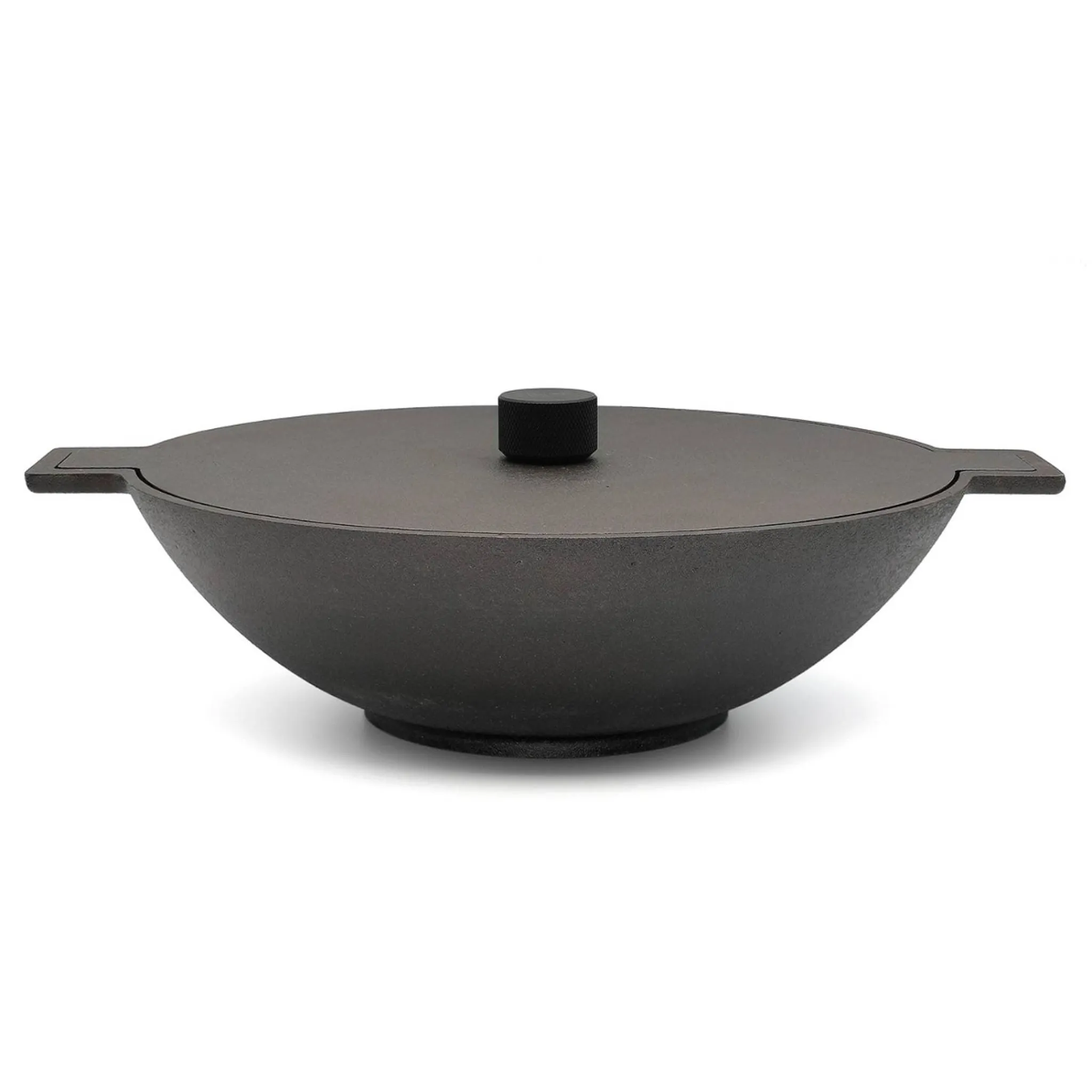 The wok has a 5mm thick bottom that heats quickly and evenly and can be used on all cooking surfaces, including induction. There are cast iron handles on each side so you can safely move it around your hob or bring it to the table to serve dishes family-style. The wok measures 34cm in diameter.