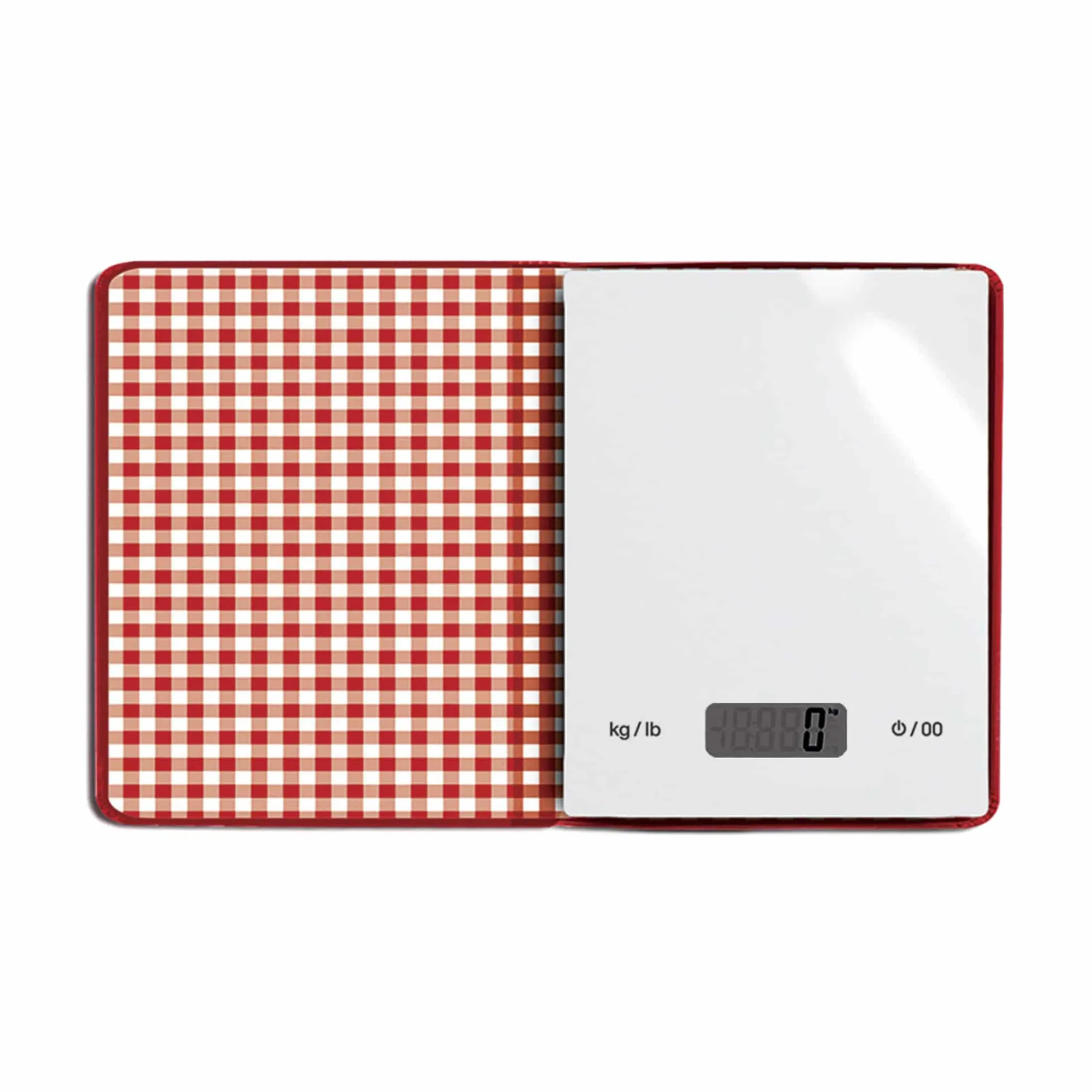 It has a wipe-clean red cover and stylish gingham interior. Inside, you’ll find digital kitchen scales which can weigh up to 5kg (11lb). The scale has a tare function which resets it to zero if you are weighing items in containers.