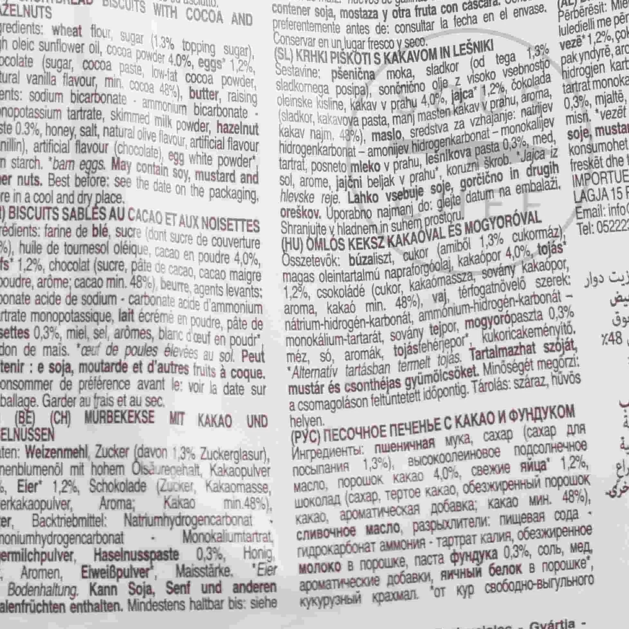Product formulations and details may change. For the latest ingredients and allergen information always check product packaging prior to consumption. Ingredients: Wheat flour, sugar (of which sugar 1,3% for topping), sunflower oil 12%, cacao powder 4,0%, eggs, chocolate (sugar, cocoa mass, low fat cocoa powder, flavouring; cocoa min.48% ), butter, raising agents: sodium hydrogen carbonate, ammonium hydrogen carbonate, monopotassium tartrate, skim milk powder, hazelnut paste 0,3%, honey, salt, flavourings, powdered egg white, corn starch. *barn eggs