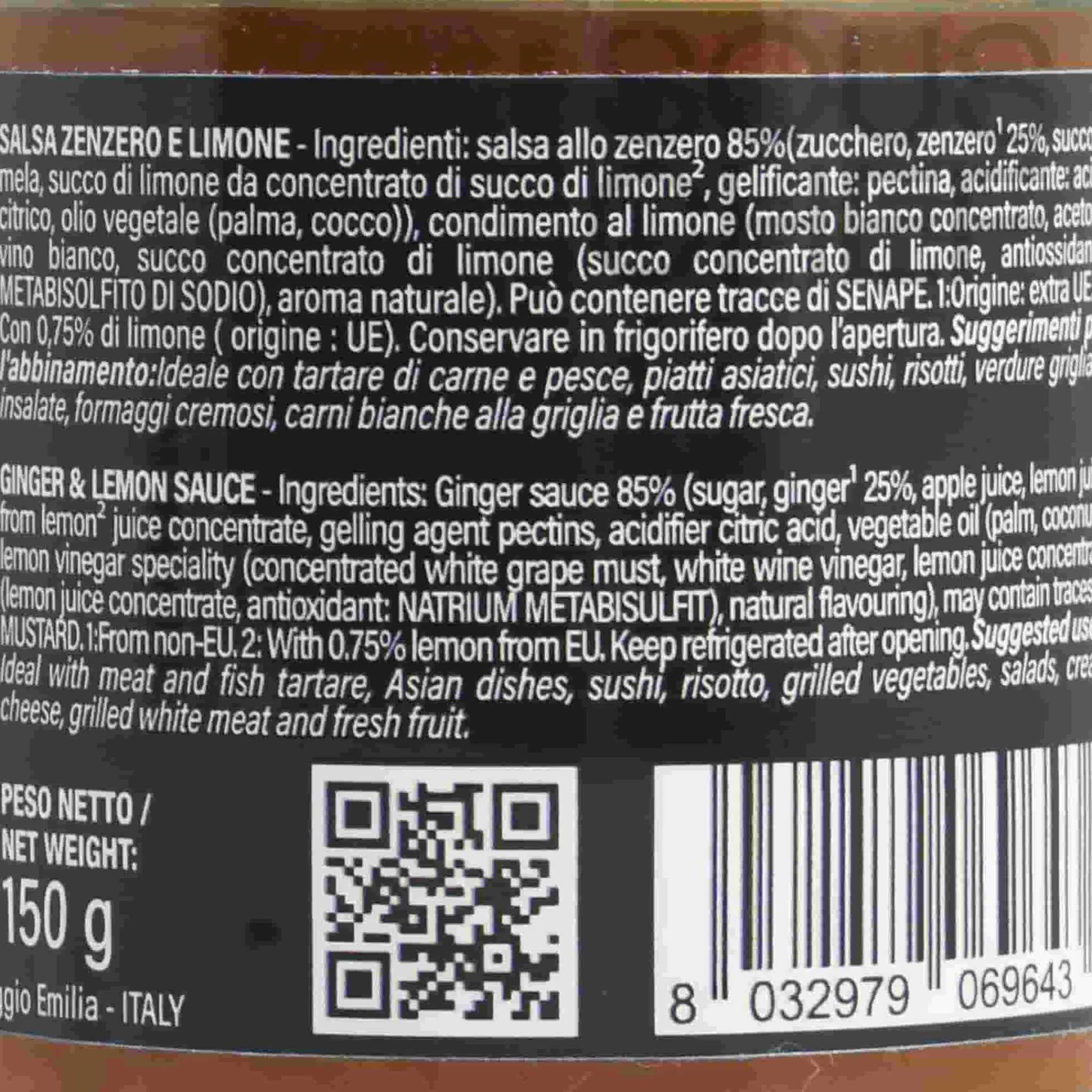 Product formulations and details may change. For the latest ingredients and allergen information always check product packaging prior to consumption. Ingredients: Ginger sauce 85% (sugar, ginger 25%, apple juice, lemon juice from lemon juice concentrate, gelling agent pectins, acidifier citric acid, vegetable oil (palm, coconut)), lemon vinegar speciality (concentrated white grape must, white wine vinegar, lemon juice concentrate (lemon juice concentrate, antioxidant: natrium metabisulfit), natural flavouring). Contains sulphites.