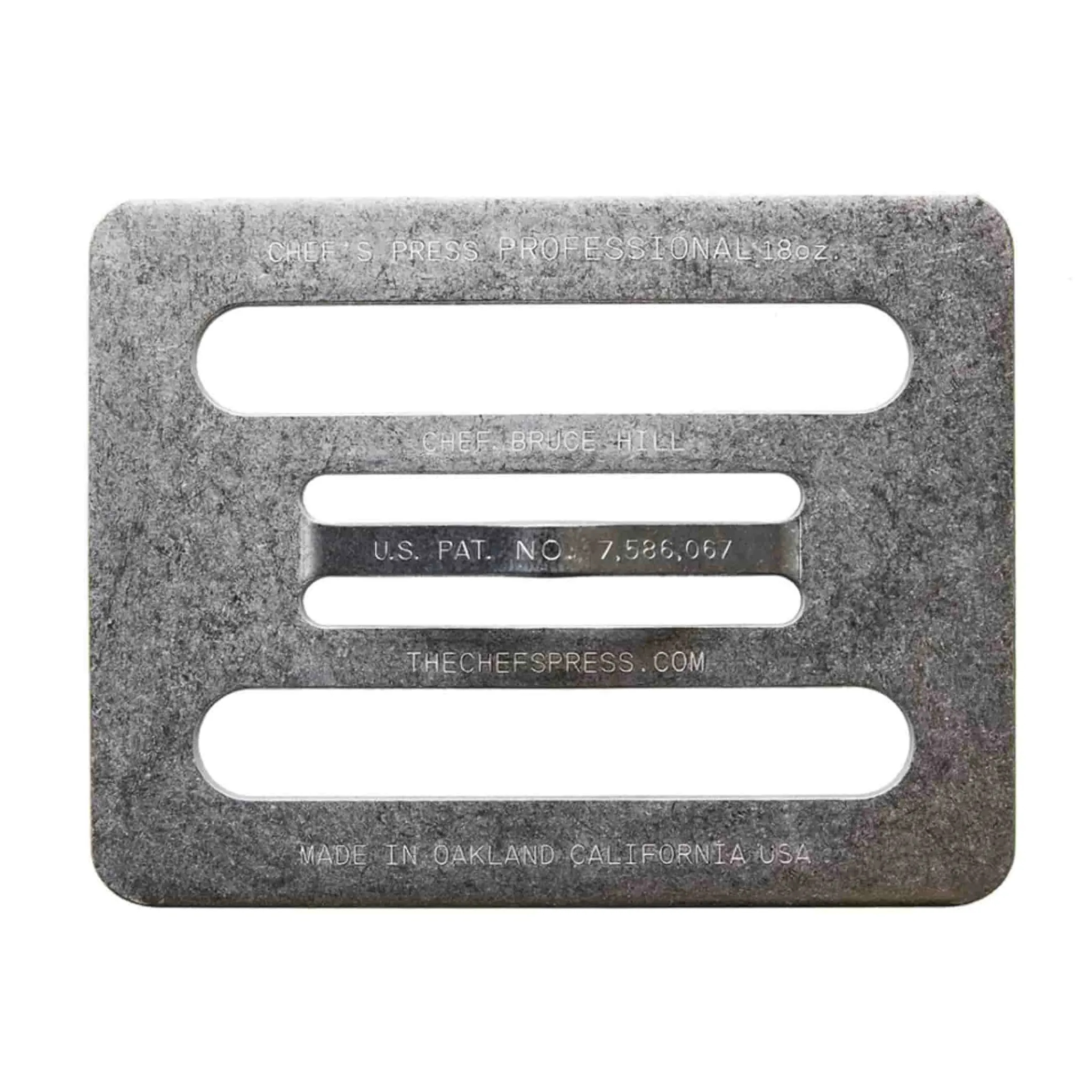 The Chef’s Press was created by Chef Bruce Hill while he was working in a tiny kitchen of Bix Restaurant in San Francisco. The traditional cast iron weights were too heavy for many dishes and also trapped steam.
