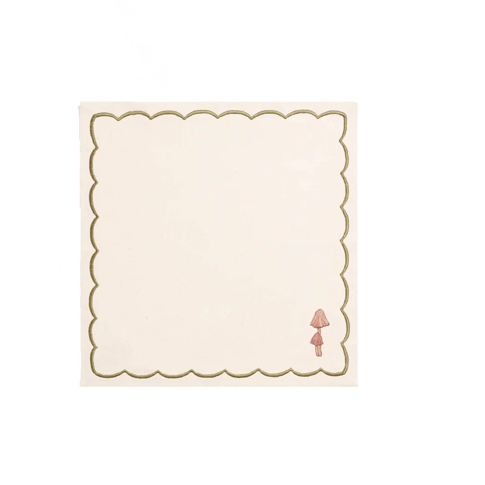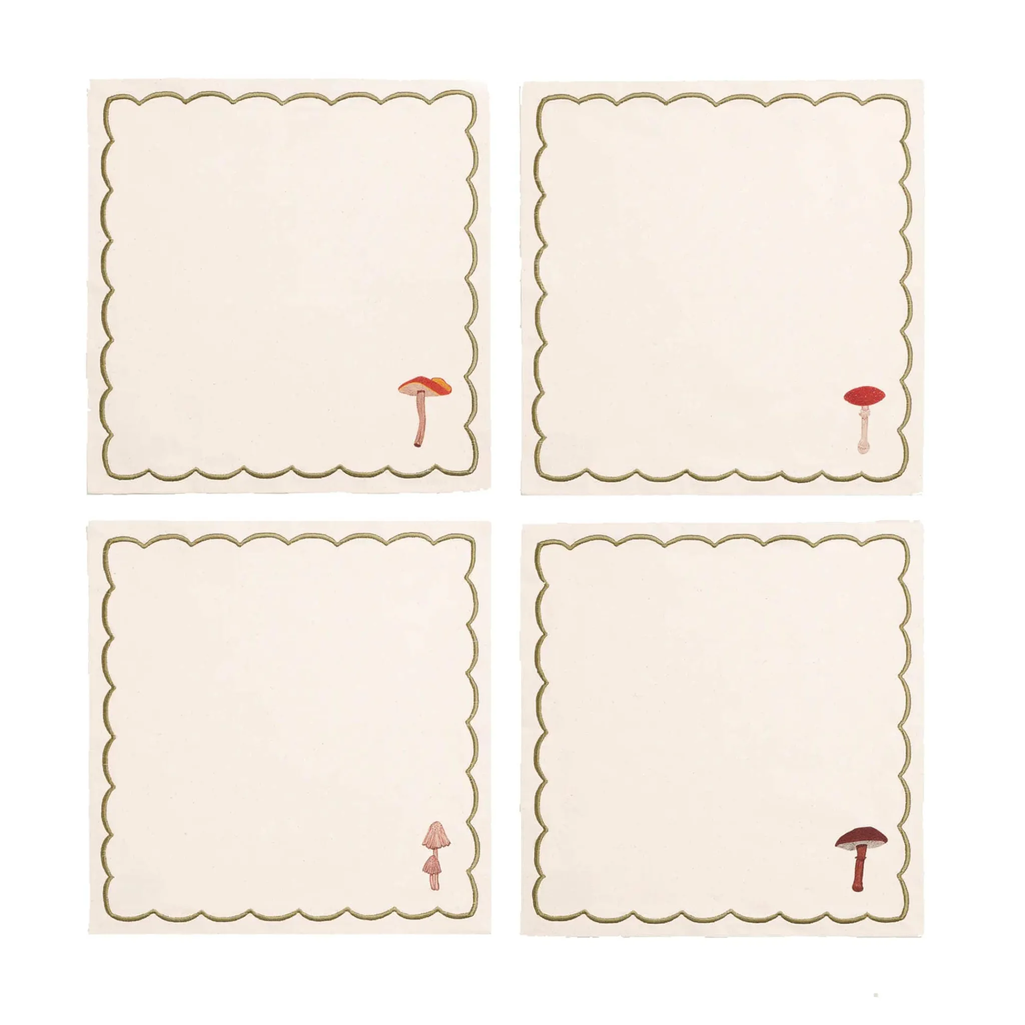 This set of four mushroom design linen napkins will add a touch of autumnal elegance to your table. Printed on high quality linen, each napkin features a different mushroom design and a wavy embroidered border. Each mushroom has its own unique shape and colour, ranging from earthy browns to pale pinks and robust reds. The designs have a delicate, playful appeal – perfect for long, leisurely lunches with friends.