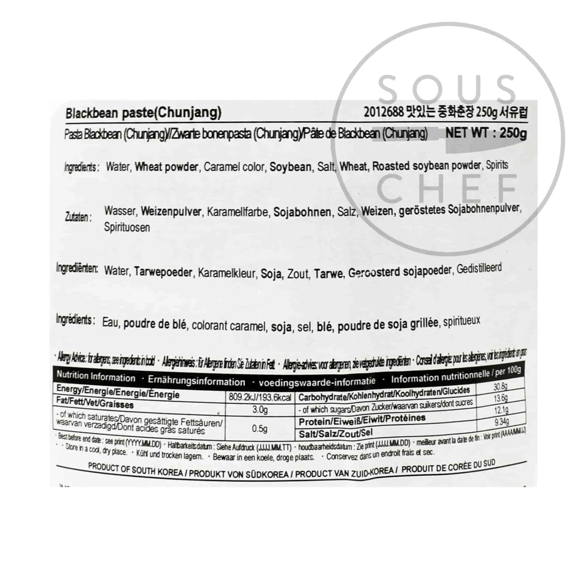 Chunjang- the Korean word for black bean paste – is an essential ingredient in Korean jajjangmyun – a Korean dish of stir-fried pork belly and mixed vegetables in a thick black bean sauce, served with wheat noodles. Also known as Chinese black bean paste, use it to give a distinctive flavour to classic Chinese dishes such as beef in black bean sauce with green peppers.