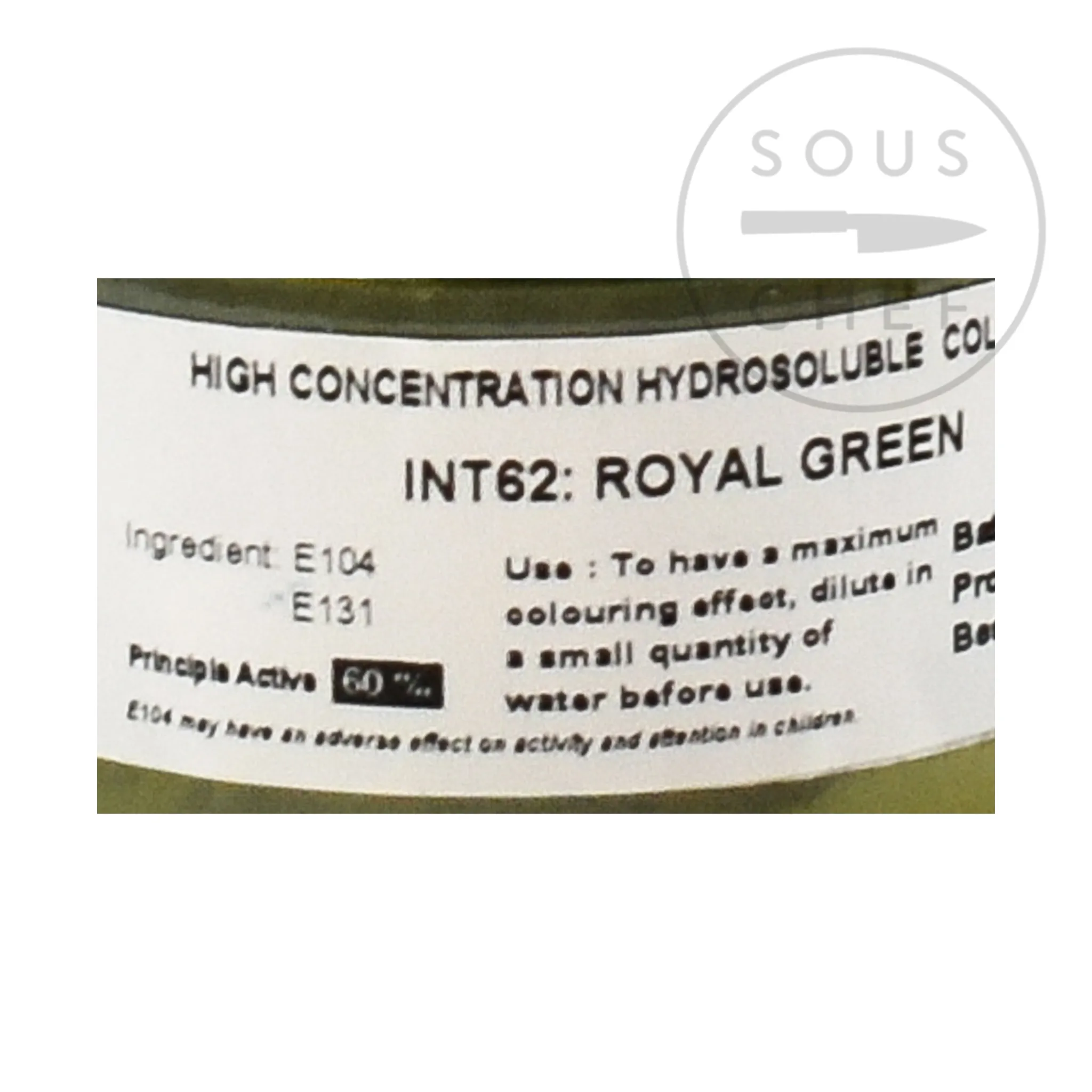 The royal green food colour is water soluble. For maximum effect, dilute in a small amount of water before use. Recommended use is 1tsp of colouring in 1tsp water to colour 2kg of sugar. Contains 50g, or approx 60ml, or 12 tsp – enough for 24kg sugar.