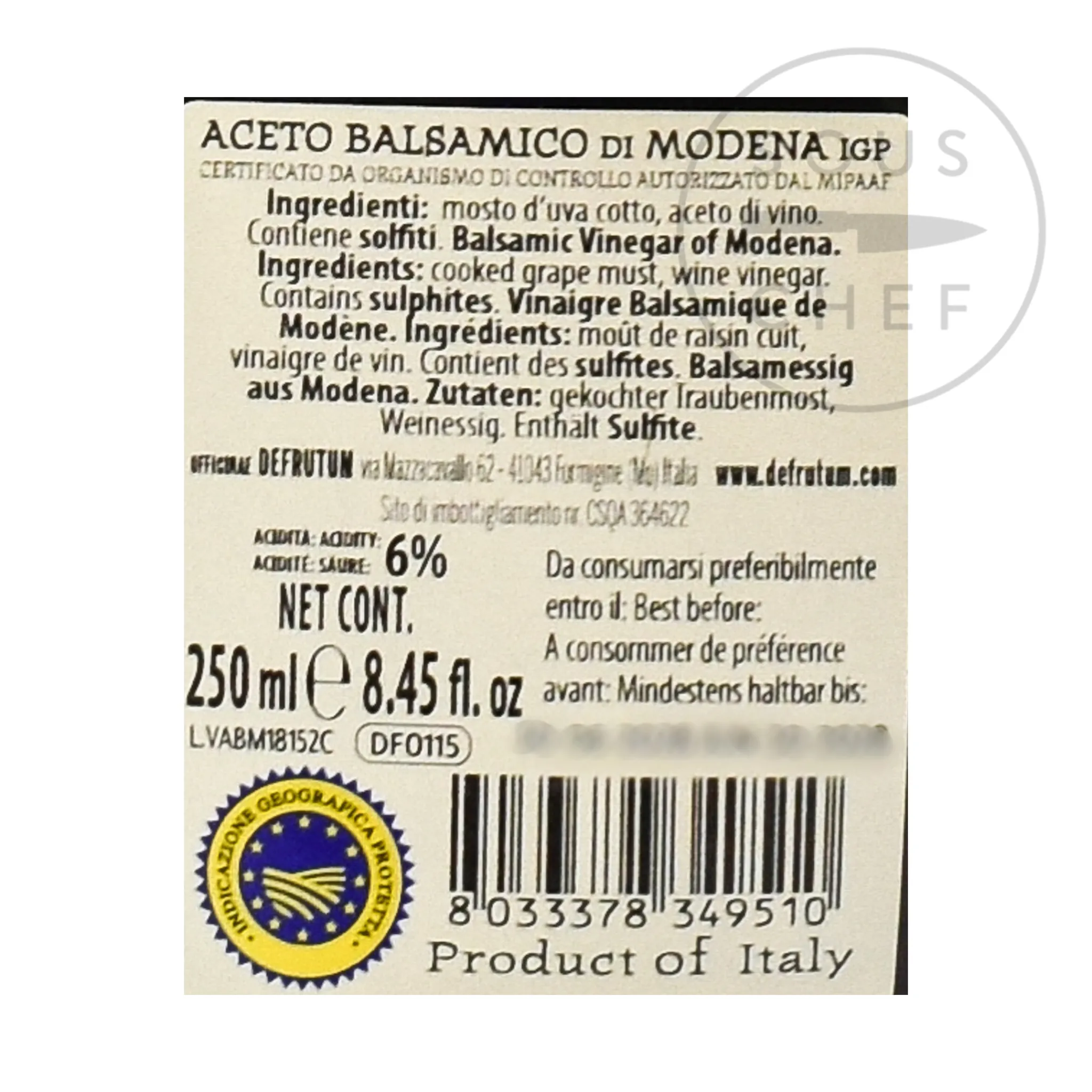 Defrutum 8-year aged balsamic vinegar has been awarded IGP, or Indicazione Geografica Protetta, status. This shows that it is one of the protected classifications of balsamic vinegar, Balsamic Vinegar of Modena. The production process is rigorously monitored – and unlike ‘balsamic condiment’ or cheaper ‘balsamic vinegars’ – which usually have no ageing, true Balsamic Vinegar of Modena must be aged for a minimum of 60 days in wood.