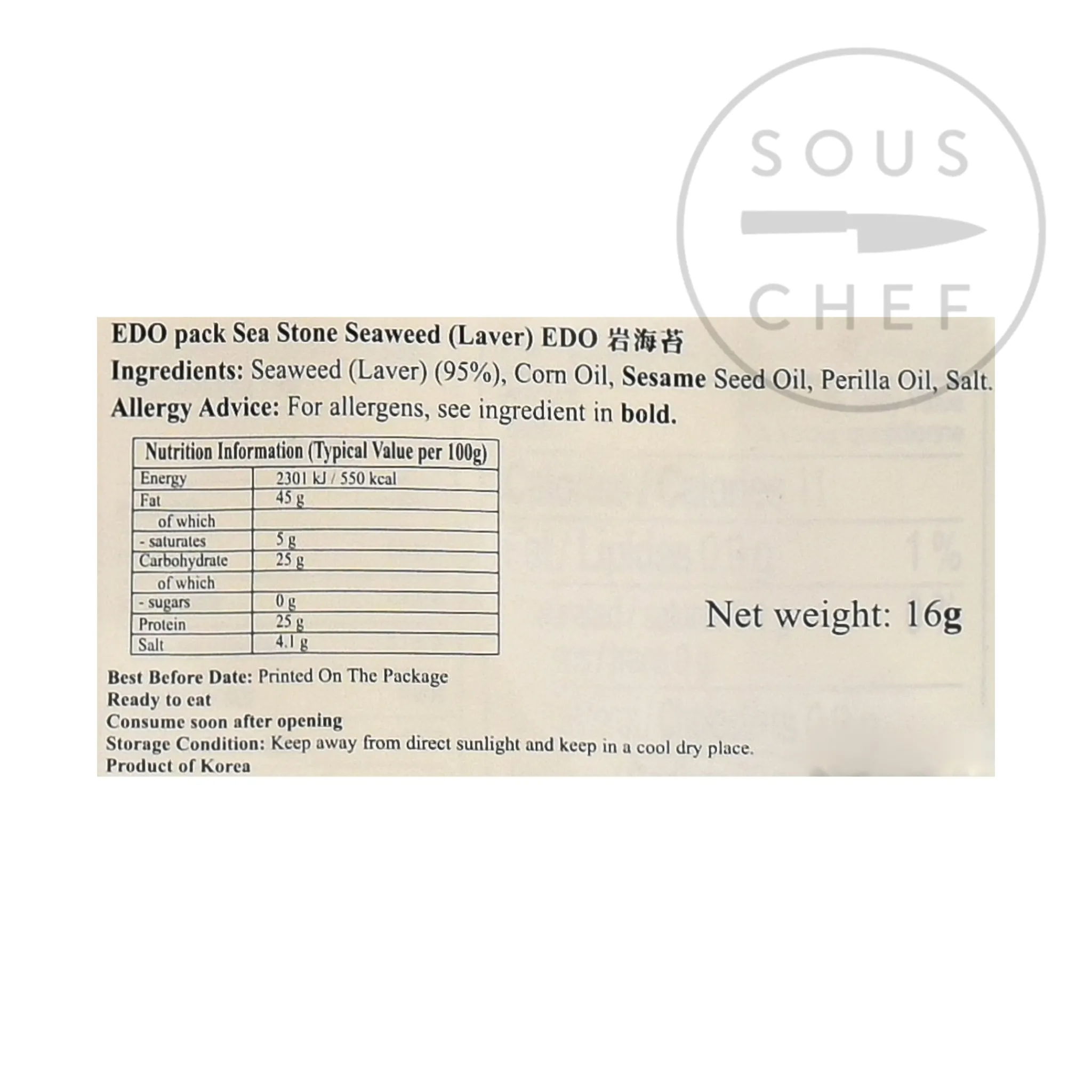 Small sheets of seasoned or flavoured seaweed laver make a tasty and low calorie snack. The seaweed is seasoned with salt and sesame oil making them great to eat straight from the packet. Also shred the sheets finely to garnish noodle dishes and ramen, or use like Japanese nori sheets to wrap around Korean or Japanese onigiri rice balls.