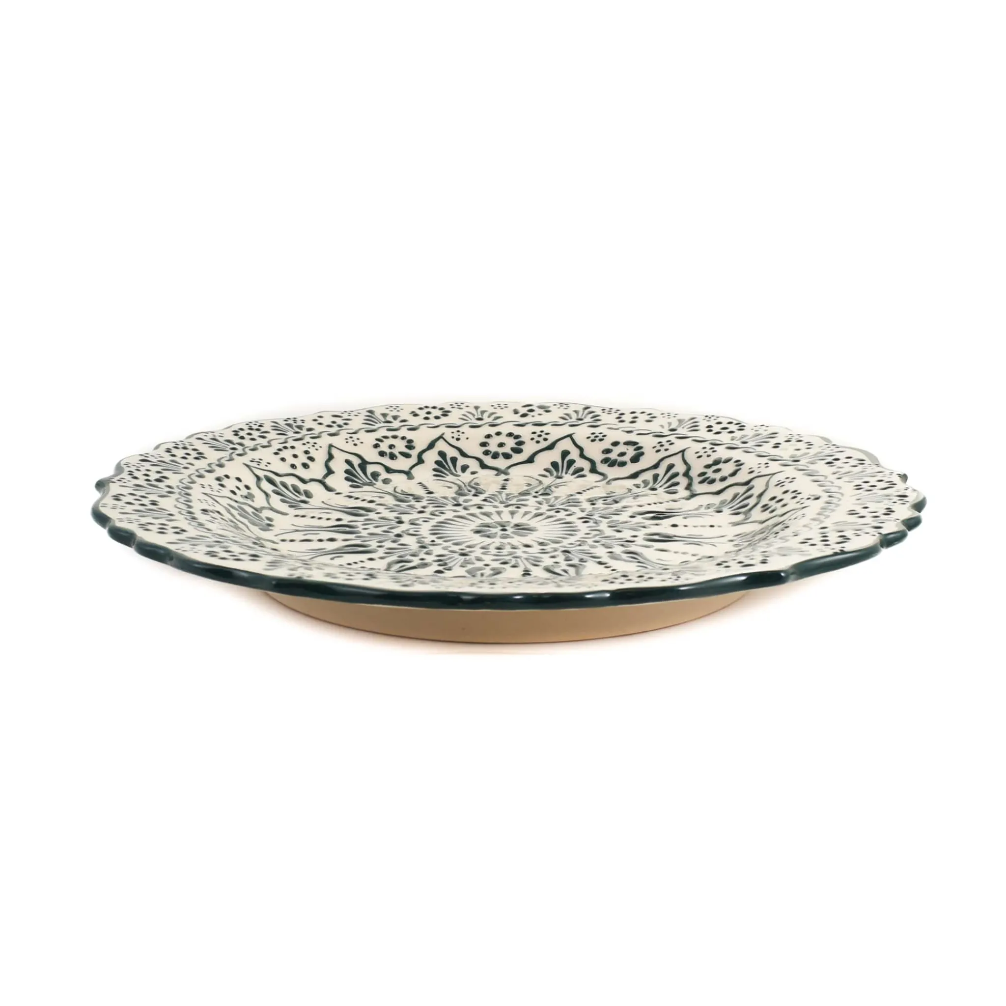 This stylish serving platter is handmade in Turkey. It features wavy sides and an intricate hand-painted design.