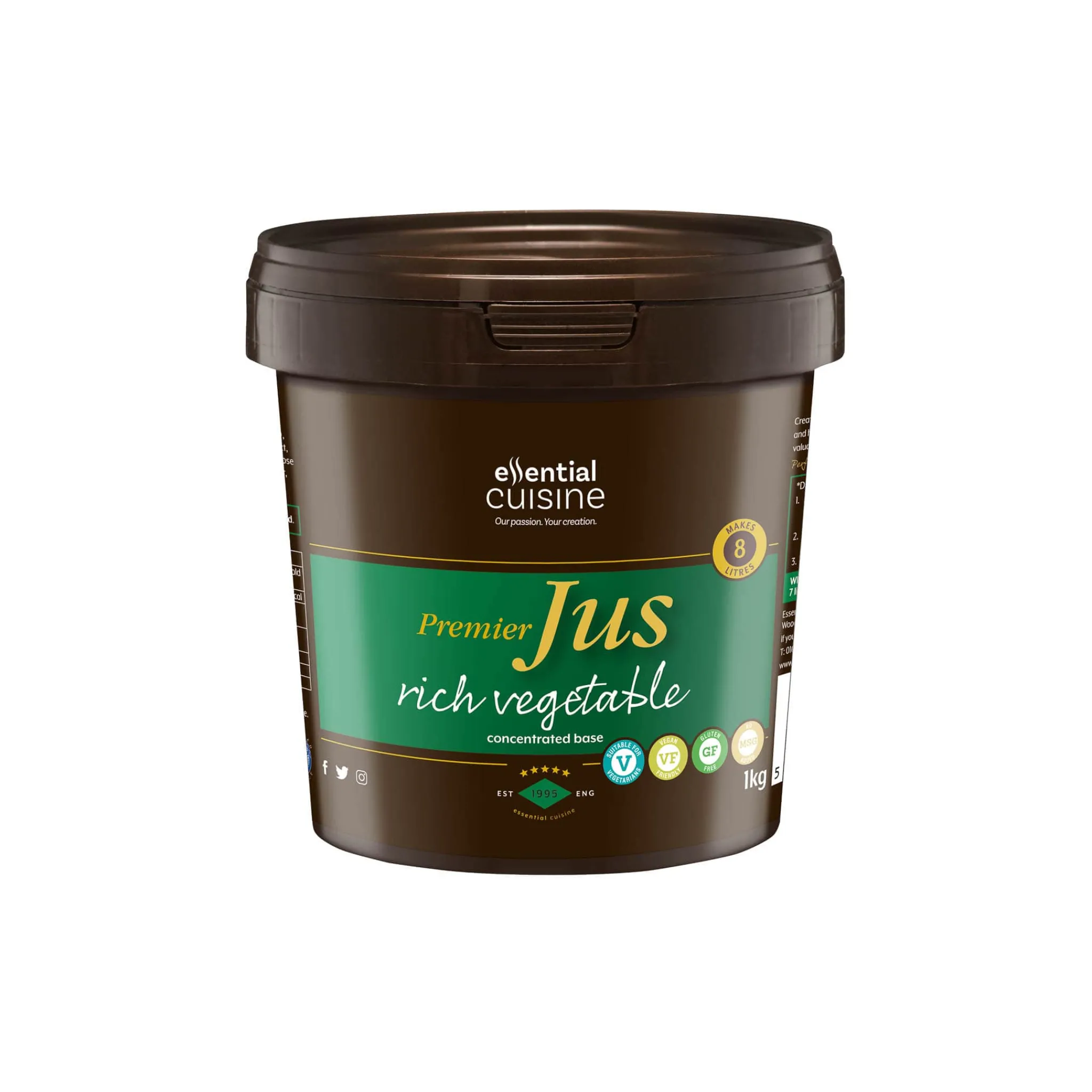 Essential Cuisine premier vegetable jus is a high-quality base for your gravies, sauces and broths.A blend of vegetable stock, herbs and spices come together to create this glossy jus. Use the concentrated vegetable jus as a base for reductions and sauces. Or, pair the vegetable jus with stock to make an aromatic broth for noodles.