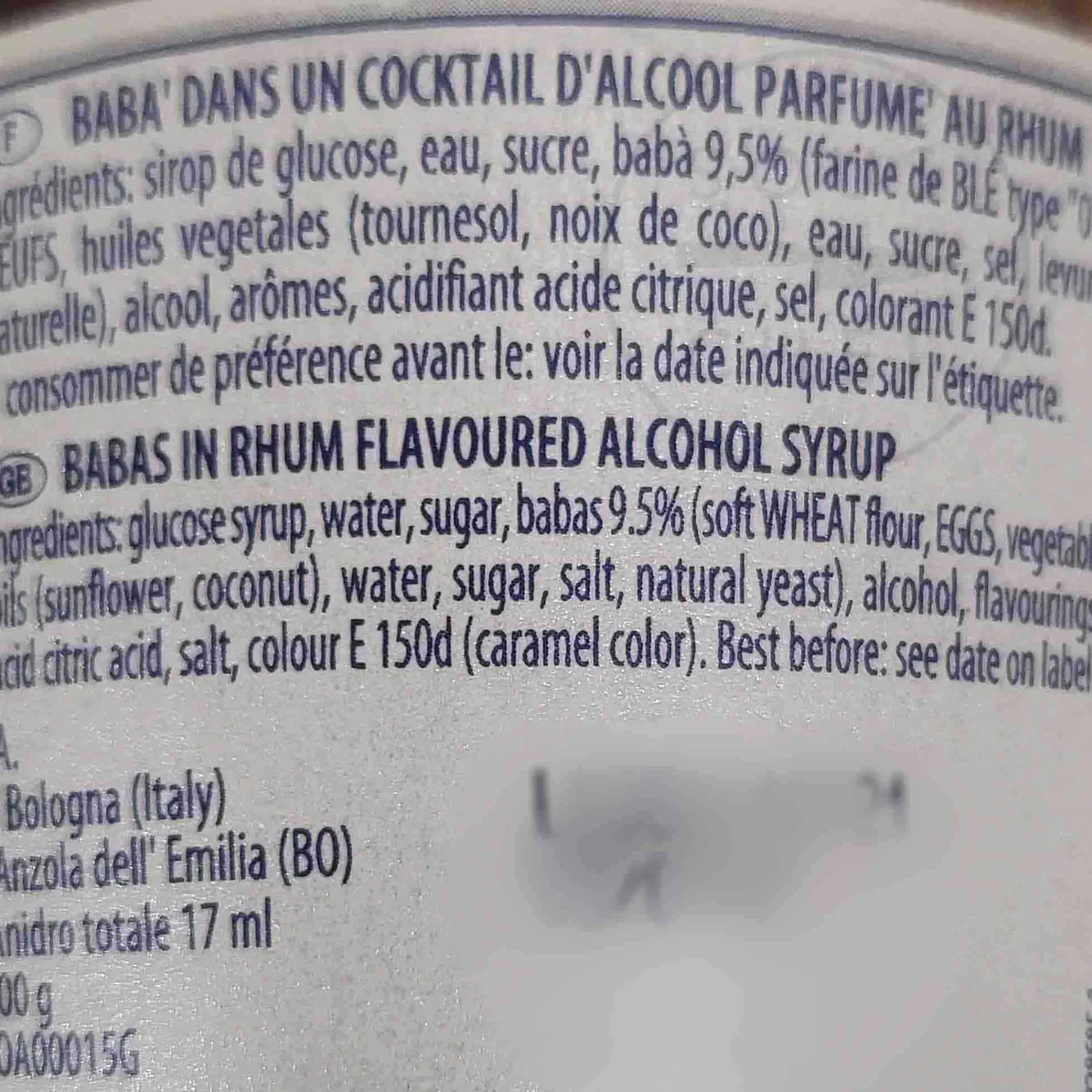 Product formulations and details may change. For the latest ingredients and allergen information always check product packaging prior to consumption. Ingredients: Glucose syrup, water, sugar, babas (9.5%) (soft wheat flour, eggs, vegetable oils (sunflower, coconut), water, sugar, salt, natural yeast), alcohol, flavourings, acid: citric acid, salt, colour E150d (caramel colour)
