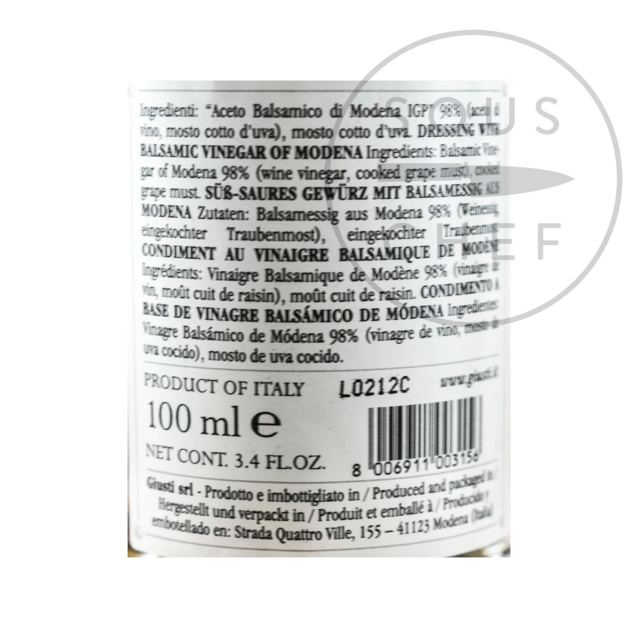 Product formulations and details may change. For the latest ingredients and allergen information always check product packaging prior to consumption. Ingredients: Balsamic vinegar of Modena 98% (cooked grape must, wine vinegar), cooked grape must. Contains sulphites.