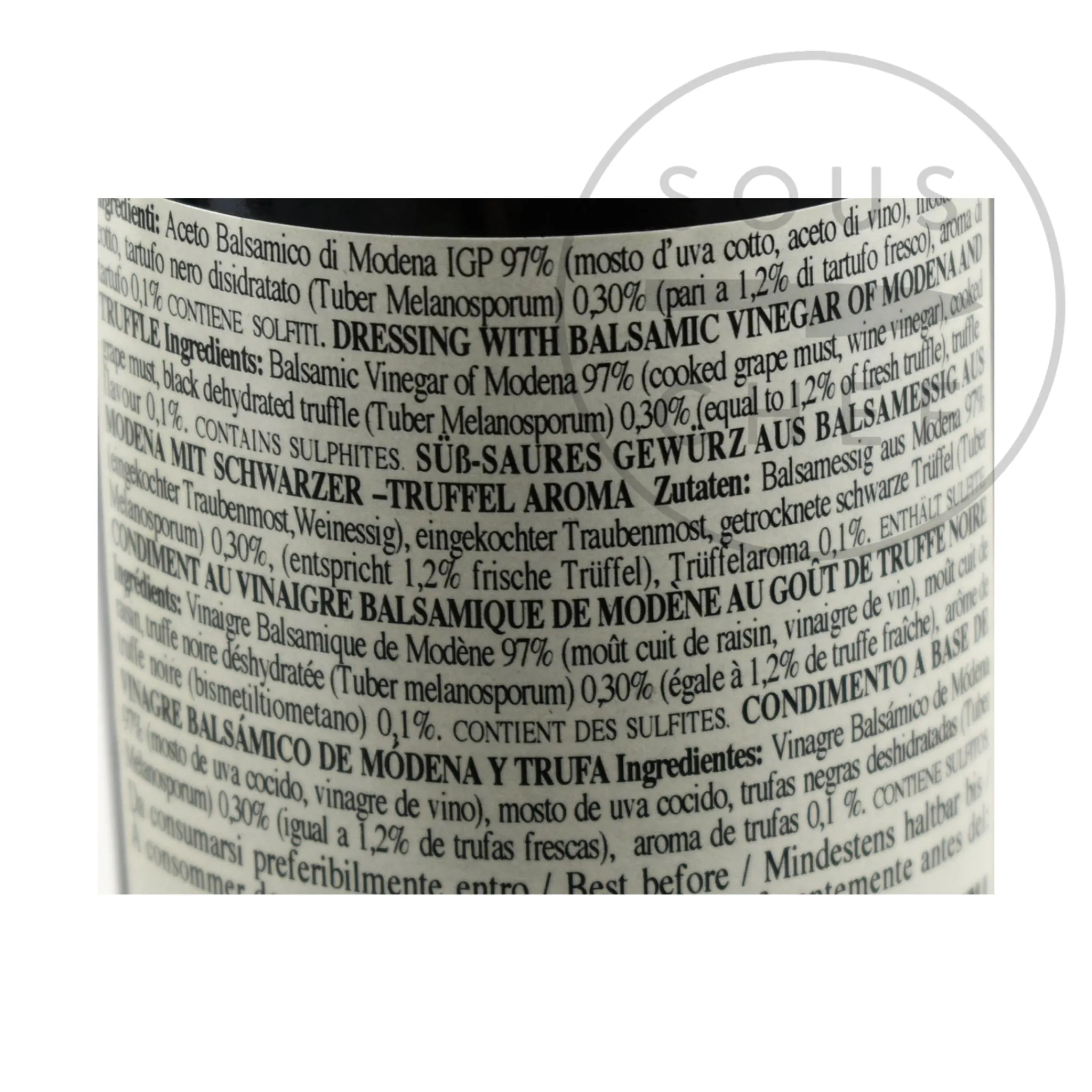 Product formulations and details may change. For the latest ingredients and allergen information always check product packaging prior to consumption. Ingredients: Raspberry vinegar: Balsamic vinegar of Modena 97% (cooked grape must, wine vinegar), cooked grape must, raspberry juice 2%, flavour. Fig vinegar: Balsamic vinegar of Modena 97% (cooked grape must, wine vinegar), cooked grape must, fig puree 2%, flavour. Black truffle vinegar: Balsamic vinegar of Modena 97% (cooked grape must, wine vinegar), cooked grape must, black dehydrated truffle (Tuber Melanosporum) 0.30% (equal to 1.2% of fresh truffle), truffle flavour 0.1%. Contains sulphites.
