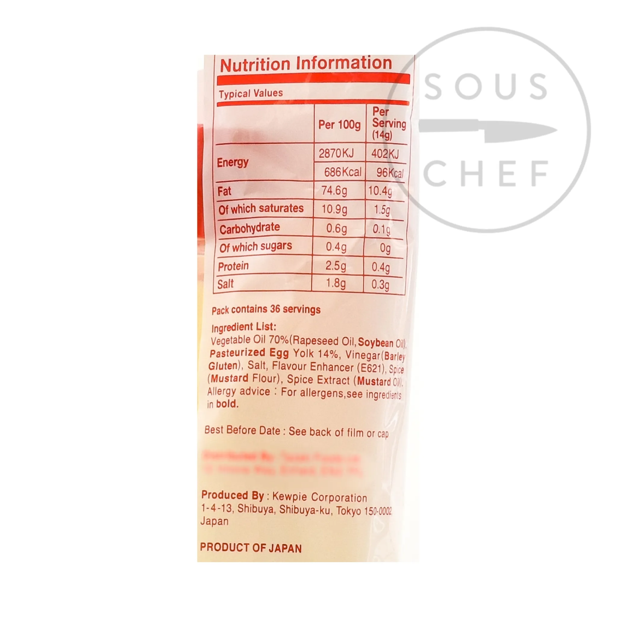 Product formulations and details may change. For the latest ingredients and allergen information always check product packaging prior to consumption. Ingredients: vegetable oils (rapeseed, soybean) (70%), egg yolk (14%), grain vinegar (water, alcohol, apple juice, corn, barley malt, glucose, sake Lees, sugar), water, salt, spice (mustard), flavour enhancer: E621, spice extract (mustard).