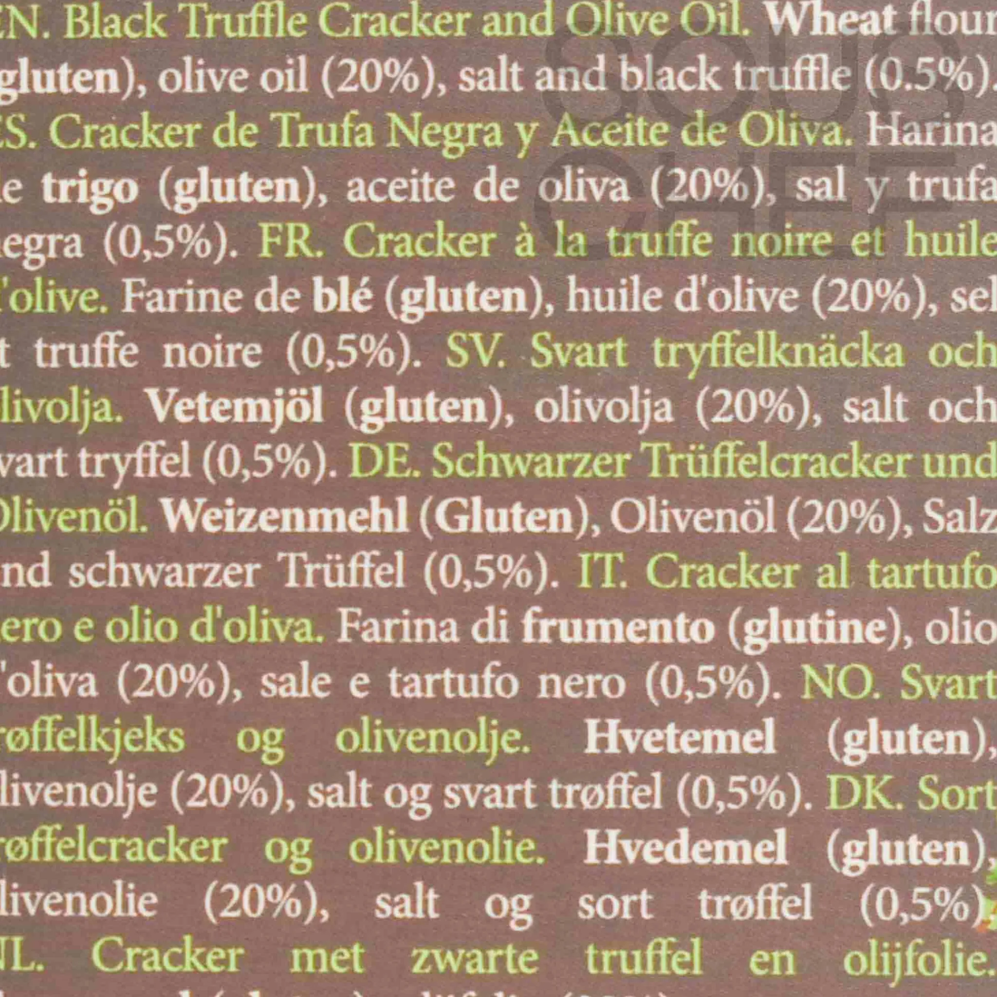 Product formulations and details may change. For the latest ingredients and allergen information always check product packaging prior to consumption. Ingredients: Wheat flour (gluten), olive oil, salt and black truffle