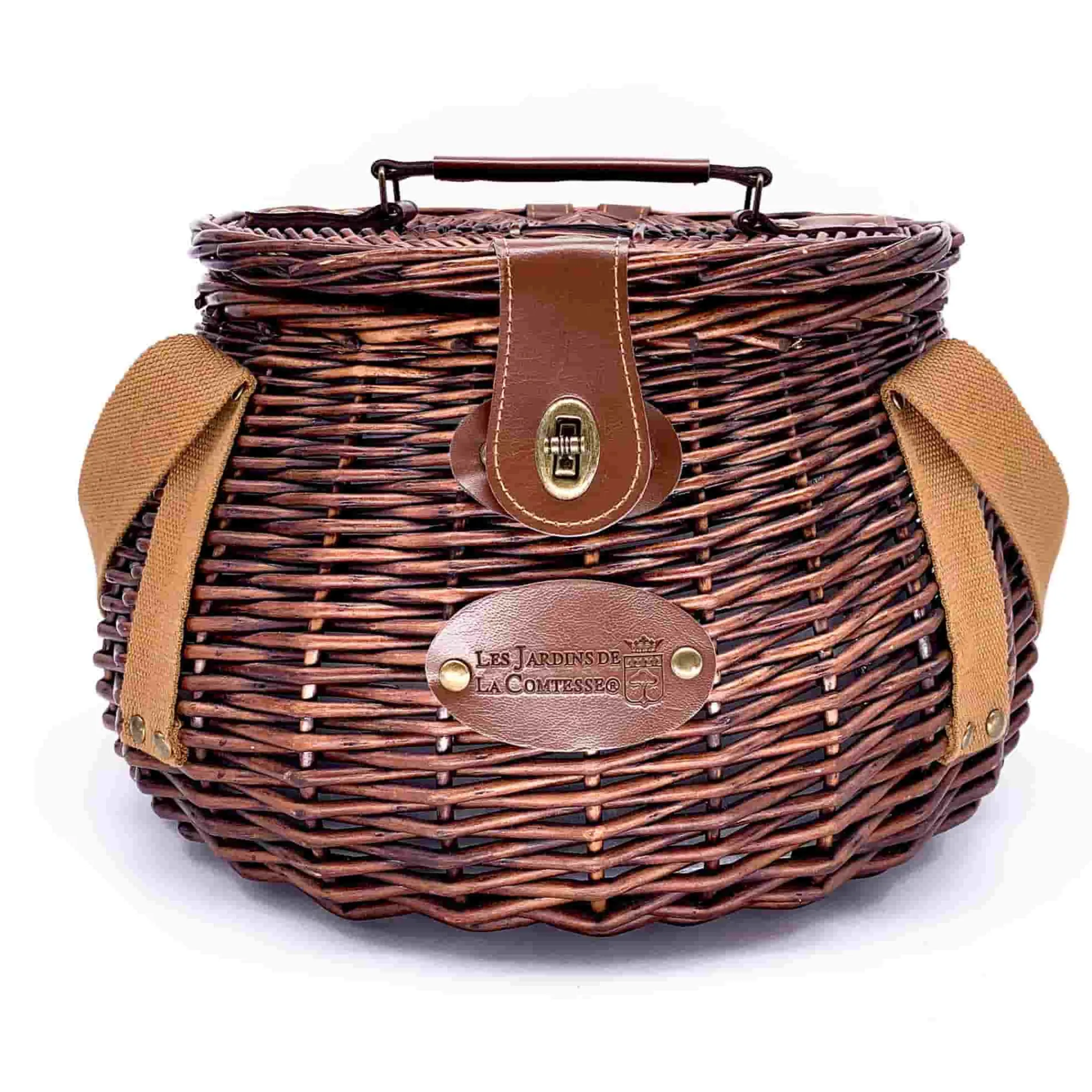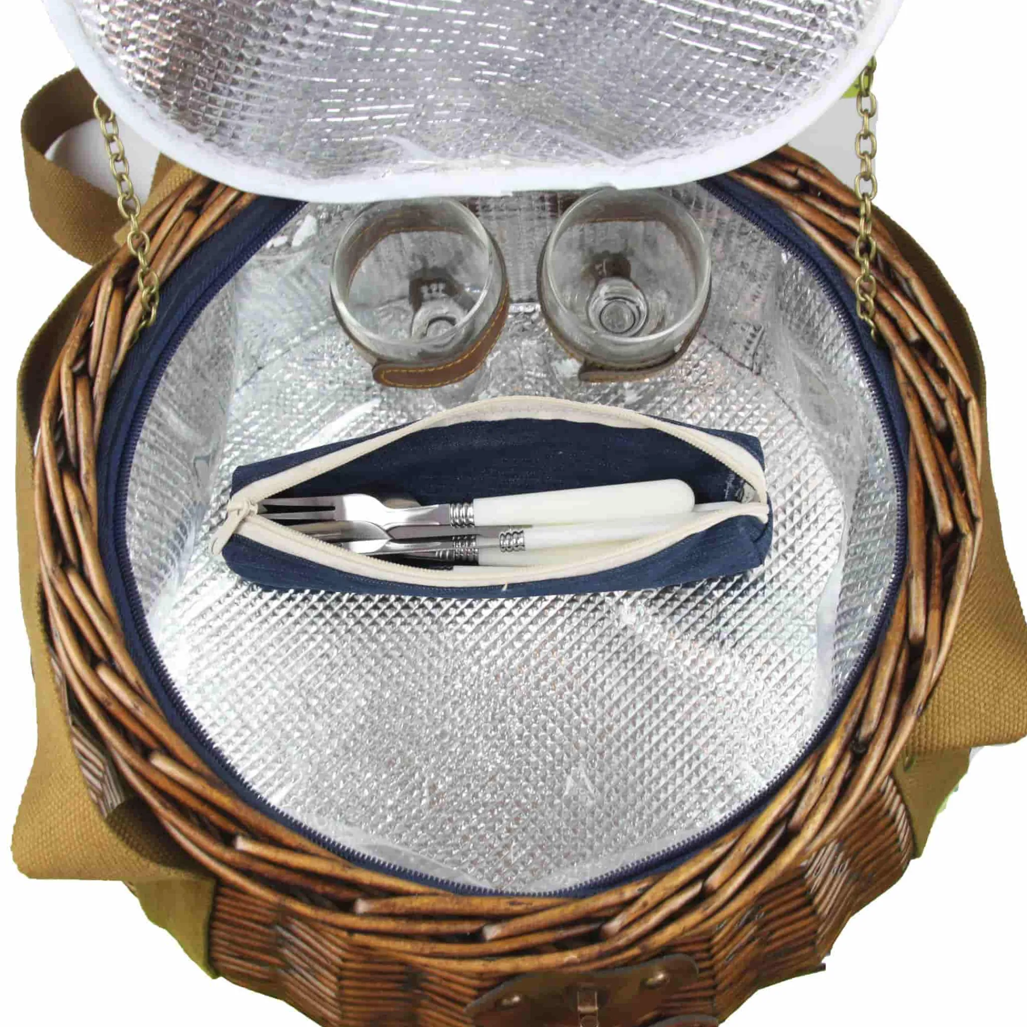 The Tuileries round picnic basket is the ideal way to transport a romantic feast for two. Handcrafted in dark brown wicker, it has a smart navy lining and an insulated pocket to keep your wine cold. It has two flexible straps so you can carry it like a bag or over your shoulder while you search for the perfect picnic spot.