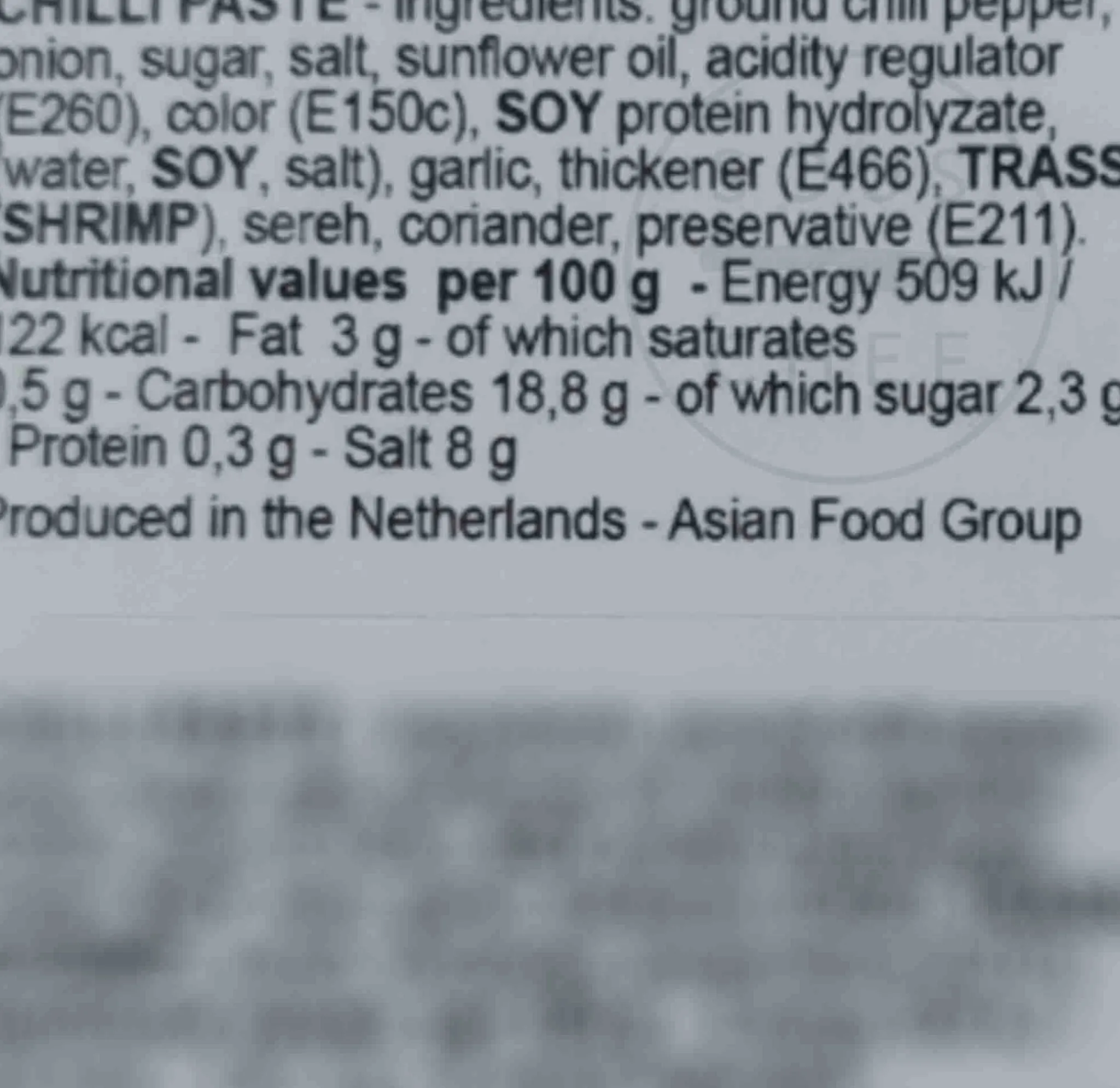 Product formulations and details may change. For the latest ingredients and allergen information always check product packaging prior to consumption. Ingredients: Ground chilli pepper, onion, sugar, salt, sunflower oil, acidity regulator (E260), color (E150c), soy protein hydrolyzate (water, soy, salt), garlic, thickener (E466), TRASSI (shrimp), sereh, coriander, preservative (E211).