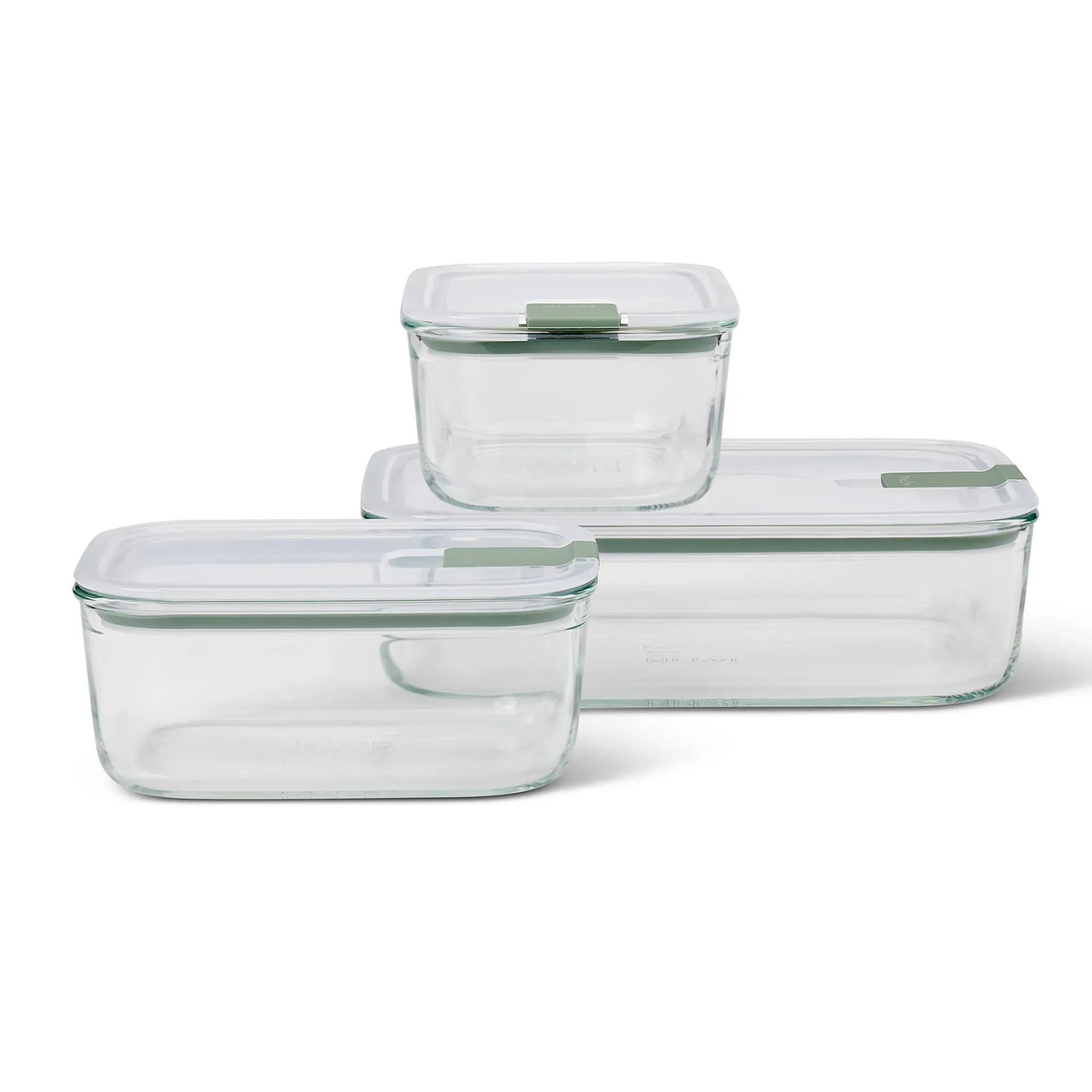 Store and serve with the Mepal EasyClip 3-piece container set. Each container is made from borosilicate glass with a vented Nordic Sage lid. Close with one click to store food in your fridge or freezer. These containers are perfect for meal prepping and batch cooking.