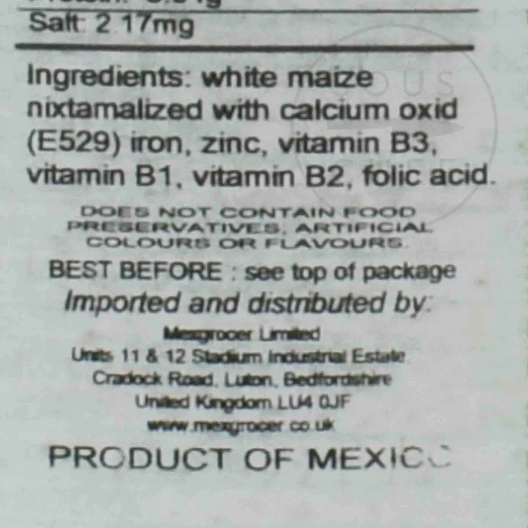 Product formulations and details may change. For the latest ingredients and allergen information always check product packaging prior to consumption. Ingredients: White maize nixtamalized with calcium oxide (e529) iron, zinc, vitamin b3, vitamin b1, vitamin b2, folic acid. Does not contain food preservatives, artificial colours or flavours.