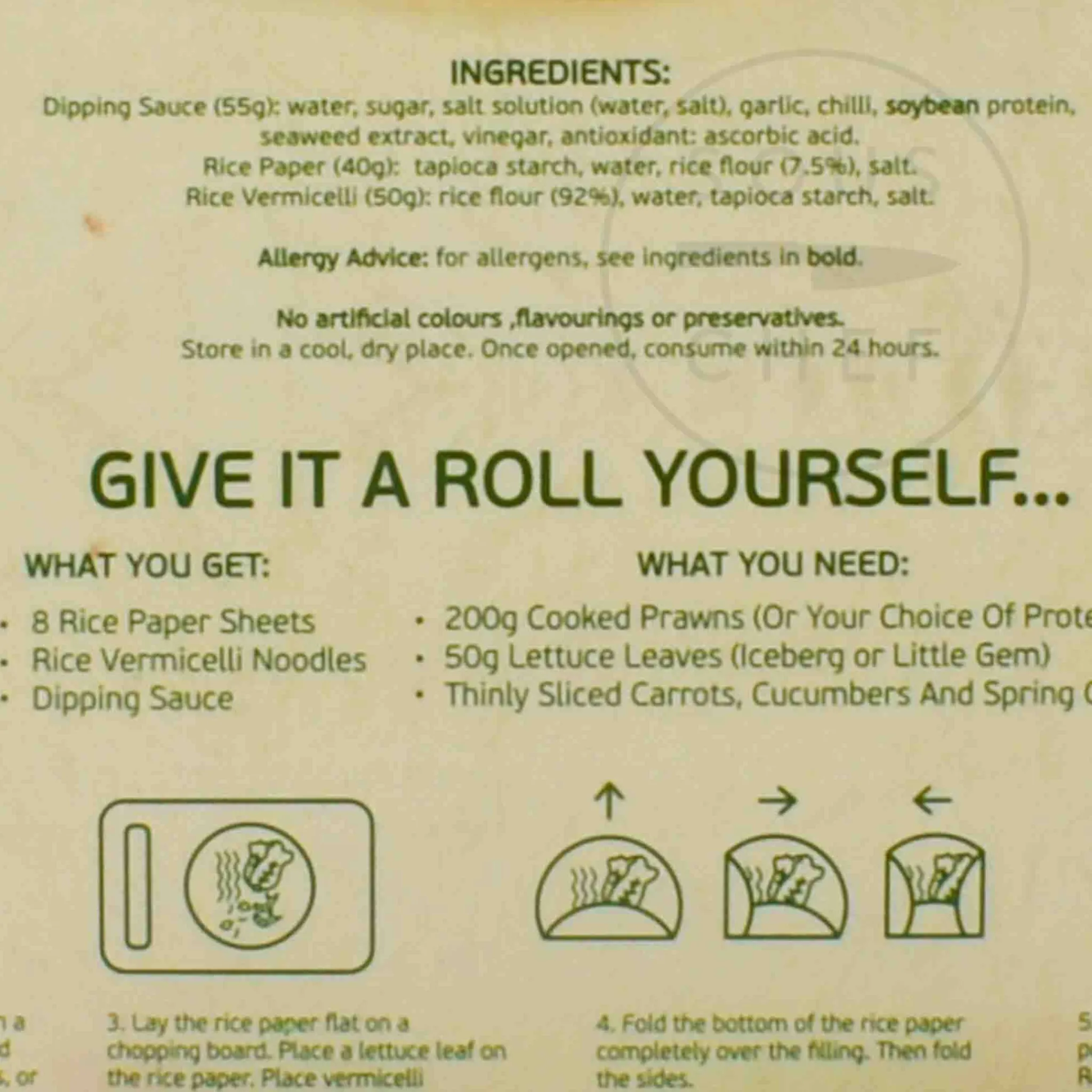 Product formulations and details may change. For the latest ingredients and allergen information always check product packaging prior to consumption. Ingredients: Dipping sauce (55g): water, sugar, salt solution (water, salt), garlic, chilli, soybean protein, seaweed extract, vinegar, antioxidant: ascorbic acid. Rice paper (40g):tapioca starch, water, rice flour (7.5%), salt. Rice vermicelli (50g): rice flour (92%), water, tapioca starch, salt.