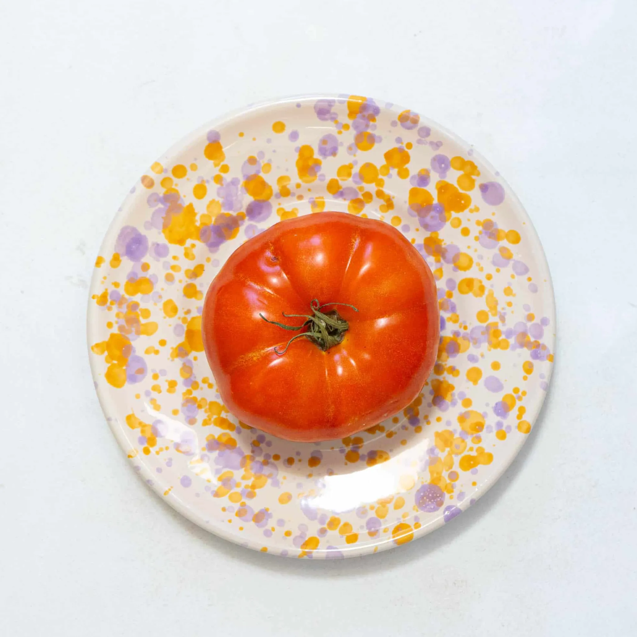 Use the Puglia two toned side plate to serve rocket salads or burrata drizzled with balsamic vinegar. Made in Italy, this ceramic plate has a playful paint splatter design in dark yellow and soft purple.