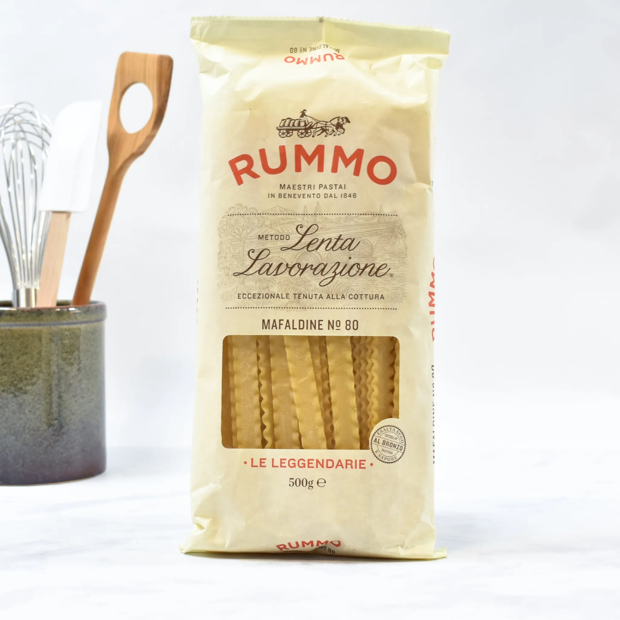 Rummo mafaldine pasta no. 80 is long wide strips of pasta with a frilly edge. Try the mafaldine pasta with a slow-braised rich ragu, or with pan-fried wild mushrooms and cream. Rummo mafaldine pasta cooks in 8 minutes. Before cooking the mafaldine pasta is 26cm long and 1.4cm wide.