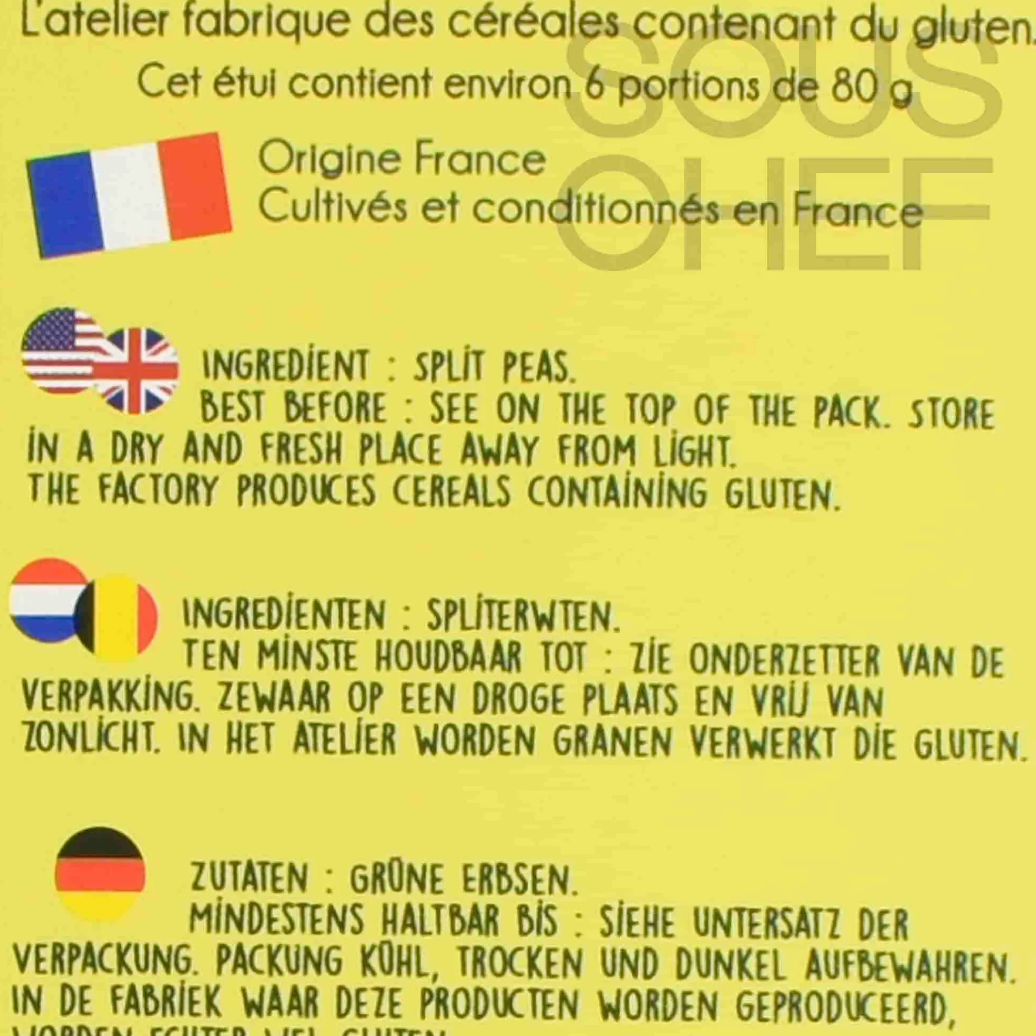 Product formulations and details may change. For the latest ingredients and allergen information always check product packaging prior to consumption. Ingredients: 100% green split peas